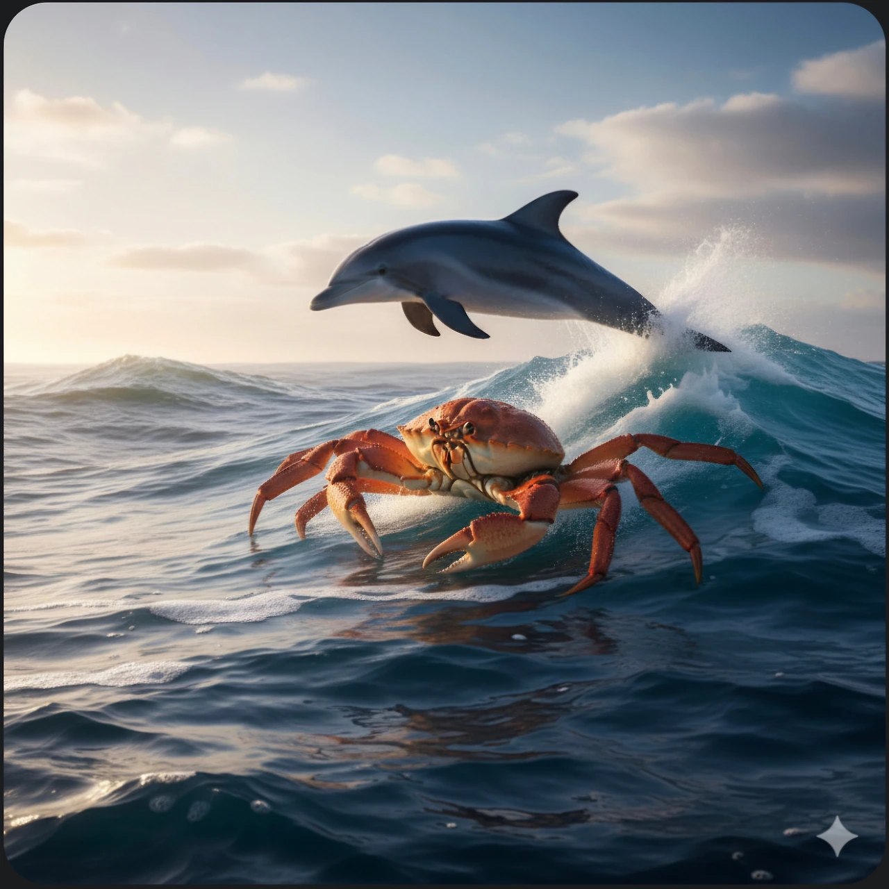 돌고래와 꽃게는 높은 파도를 타고 헤엄쳤어요.