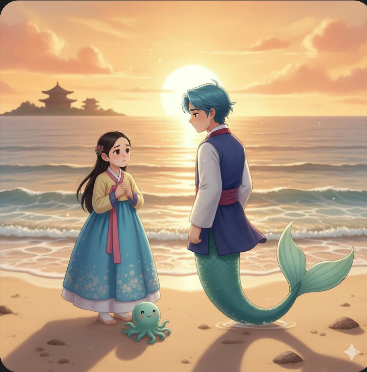문어는 바닷가에 왕자를 내려놓고 소리쳤어요.
