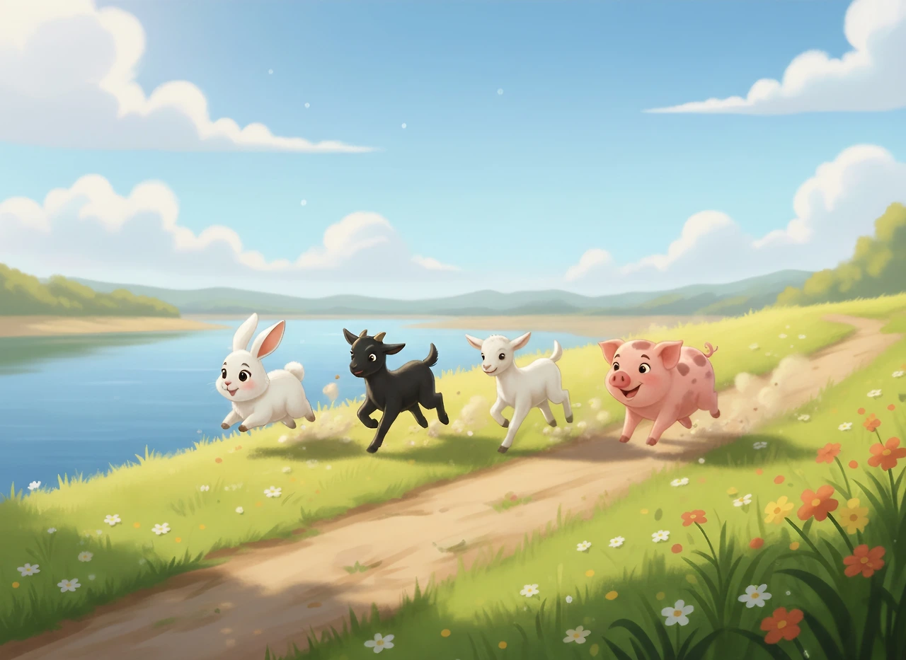 토끼, 새끼염소 두 마리, 새끼돼지가 달렸어요.