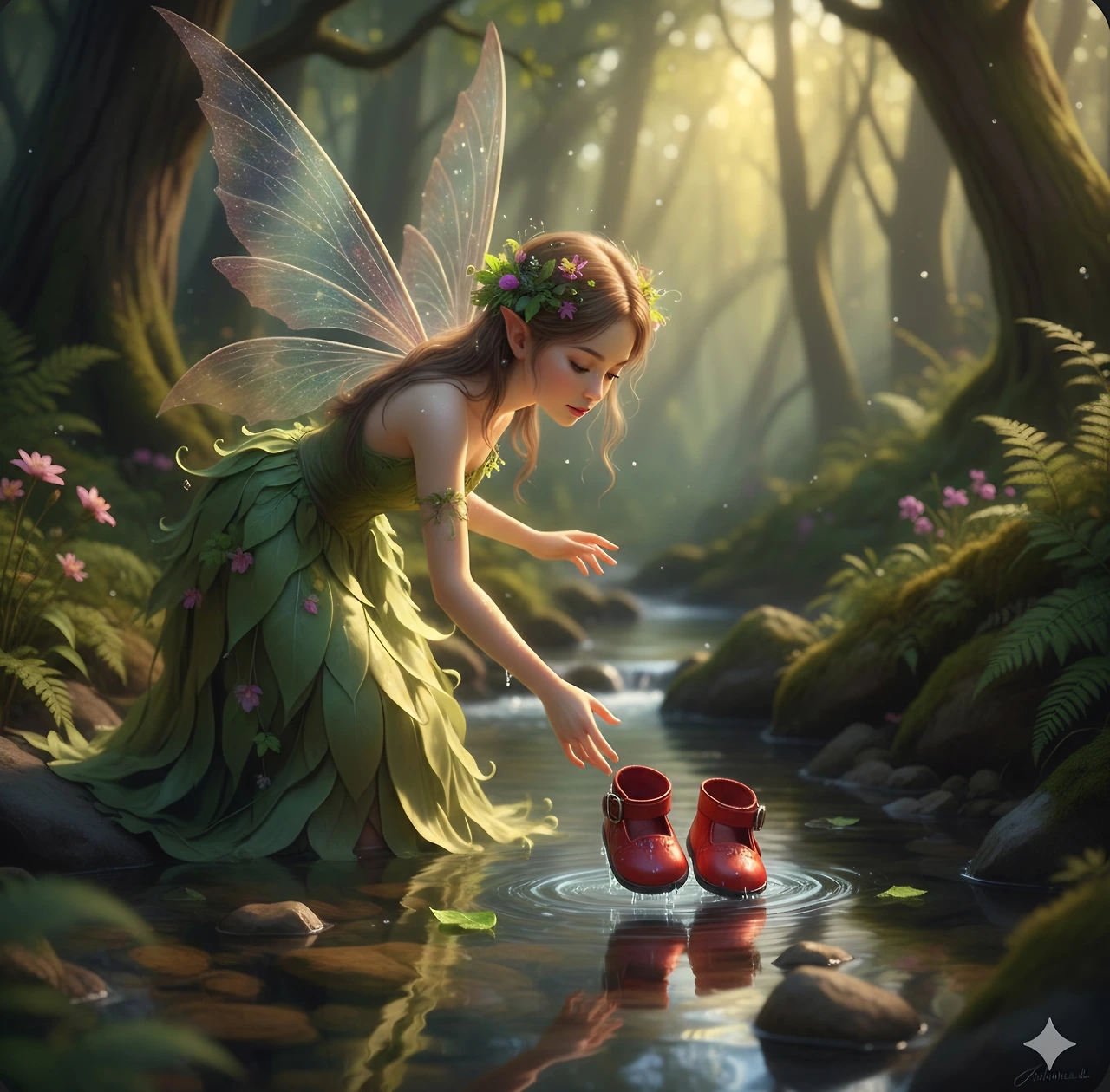 숲의 요정은 빨간 구두를 물에서 건졌어요.