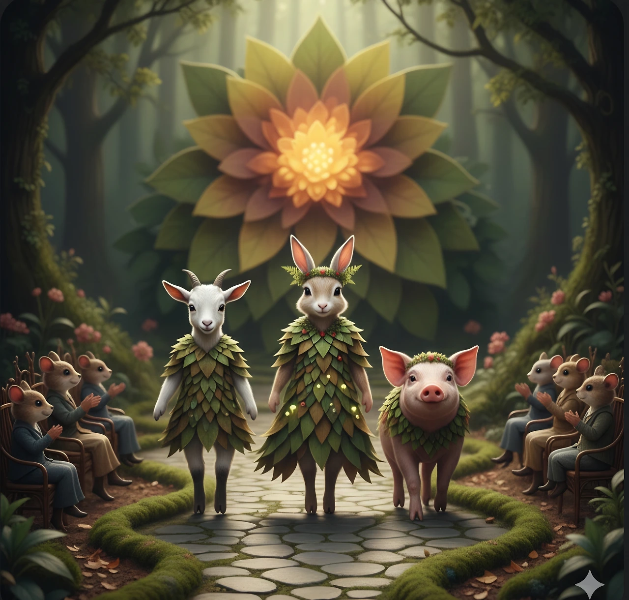 나뭇잎 옷을 입은 새끼염소가 멋지게 보였어요.