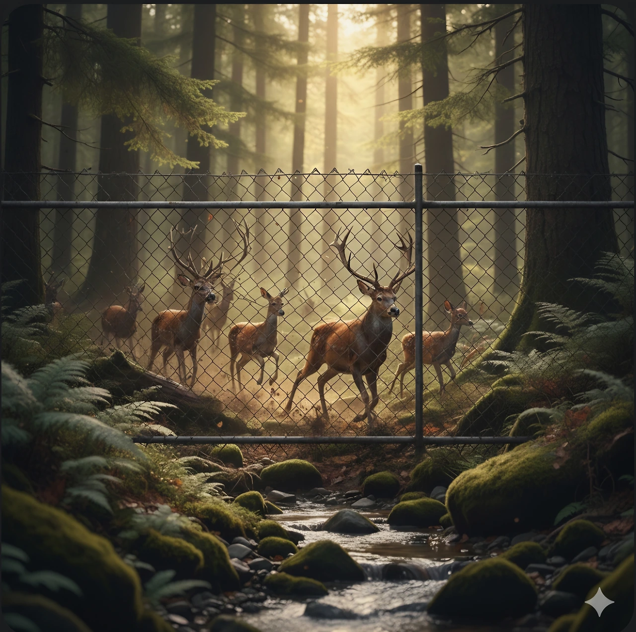 사슴목장 주인이 없는 것을 알고 아기사슴들을 가둔 우리로 다가갔어요.