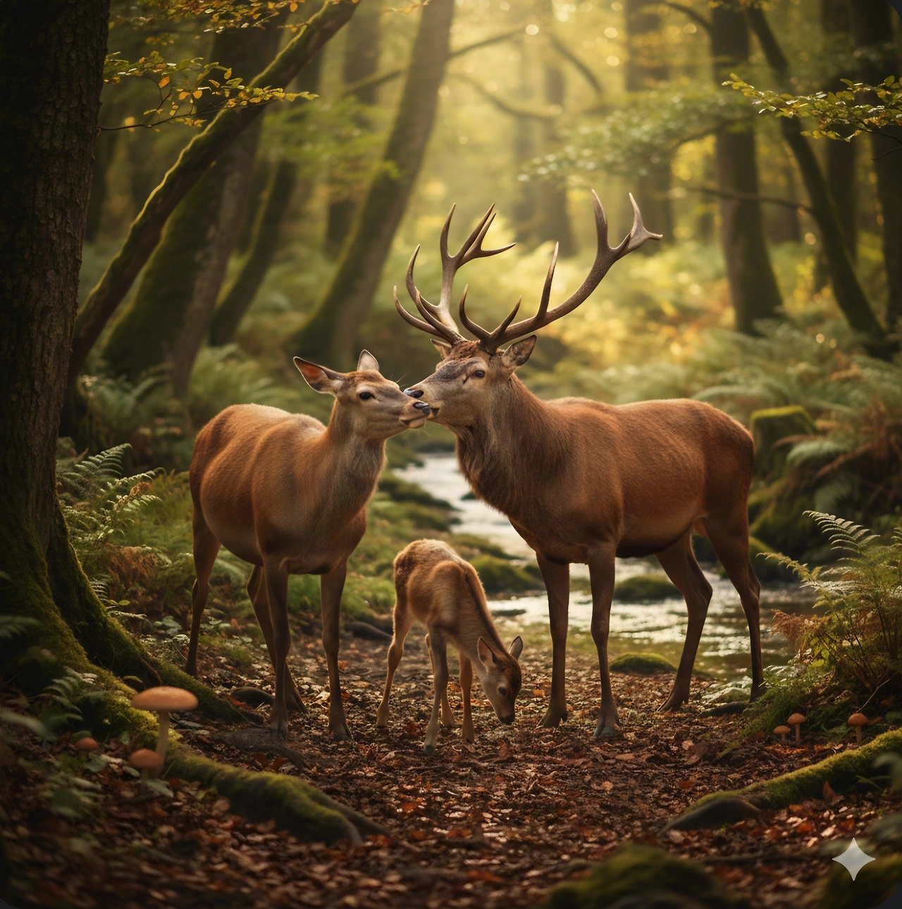 아기사슴을 안전하게 보호하는 아빠사슴과 엄마사슴이었어요.
