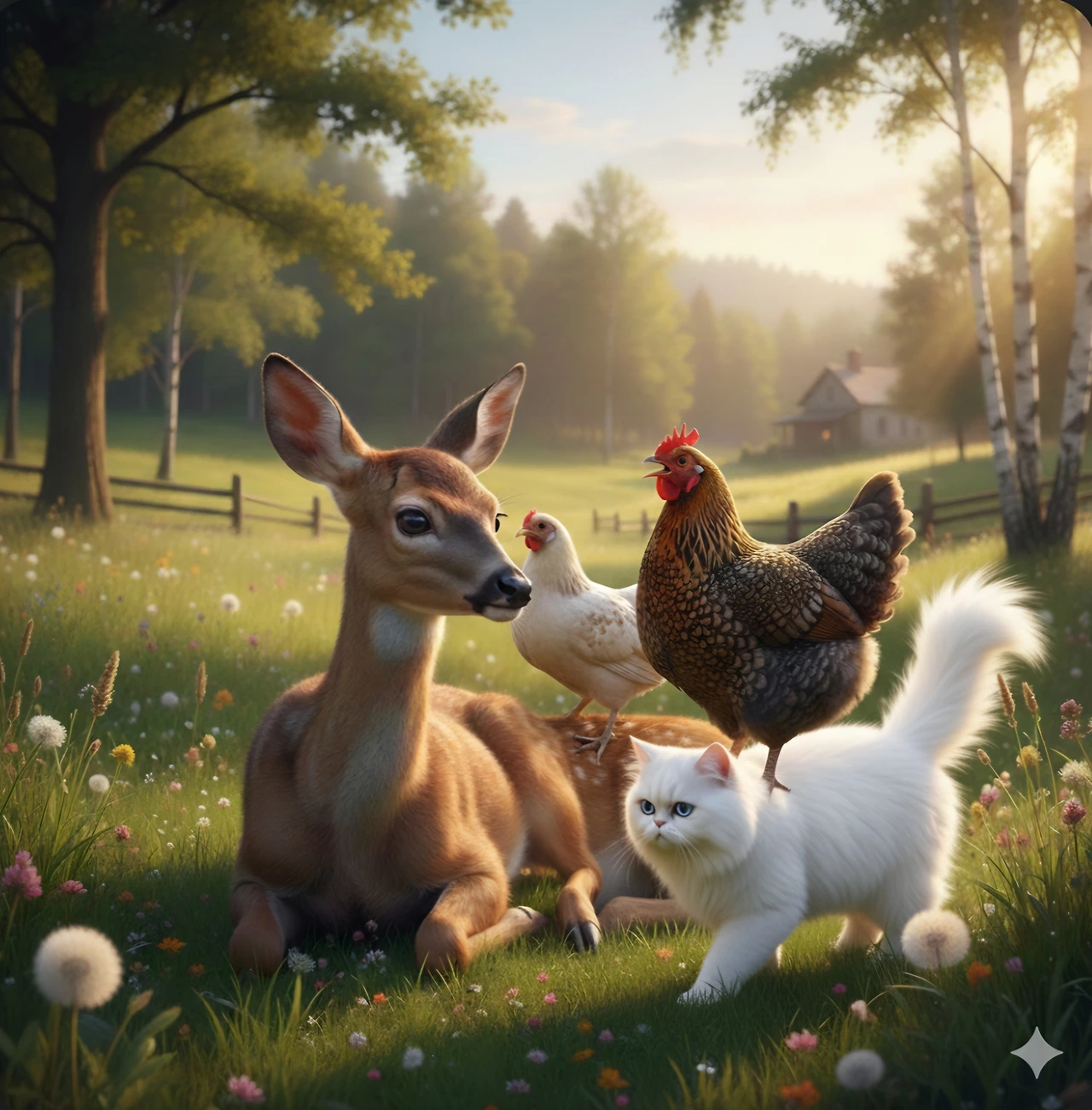 <꽃피는 사슴목장>은 사슴과 닭이 평화롭게 지냈어요.