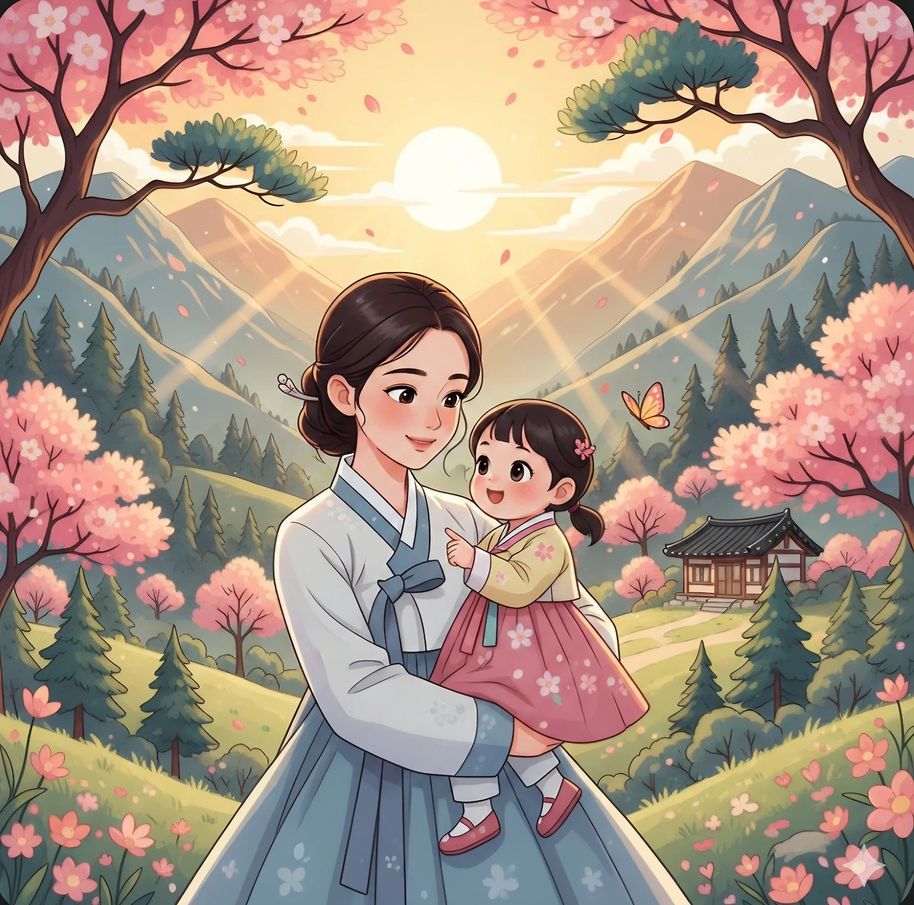숭늉을 들고 온 엄마는 새아빠 앞에 앉아 선옥을 안았어요.