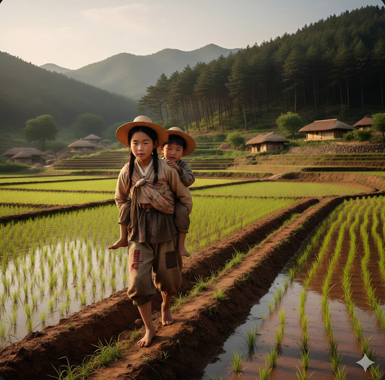 선옥은 둘째 남동생 명득을 업고 엄마가 일하는 밭으로 향했어요.