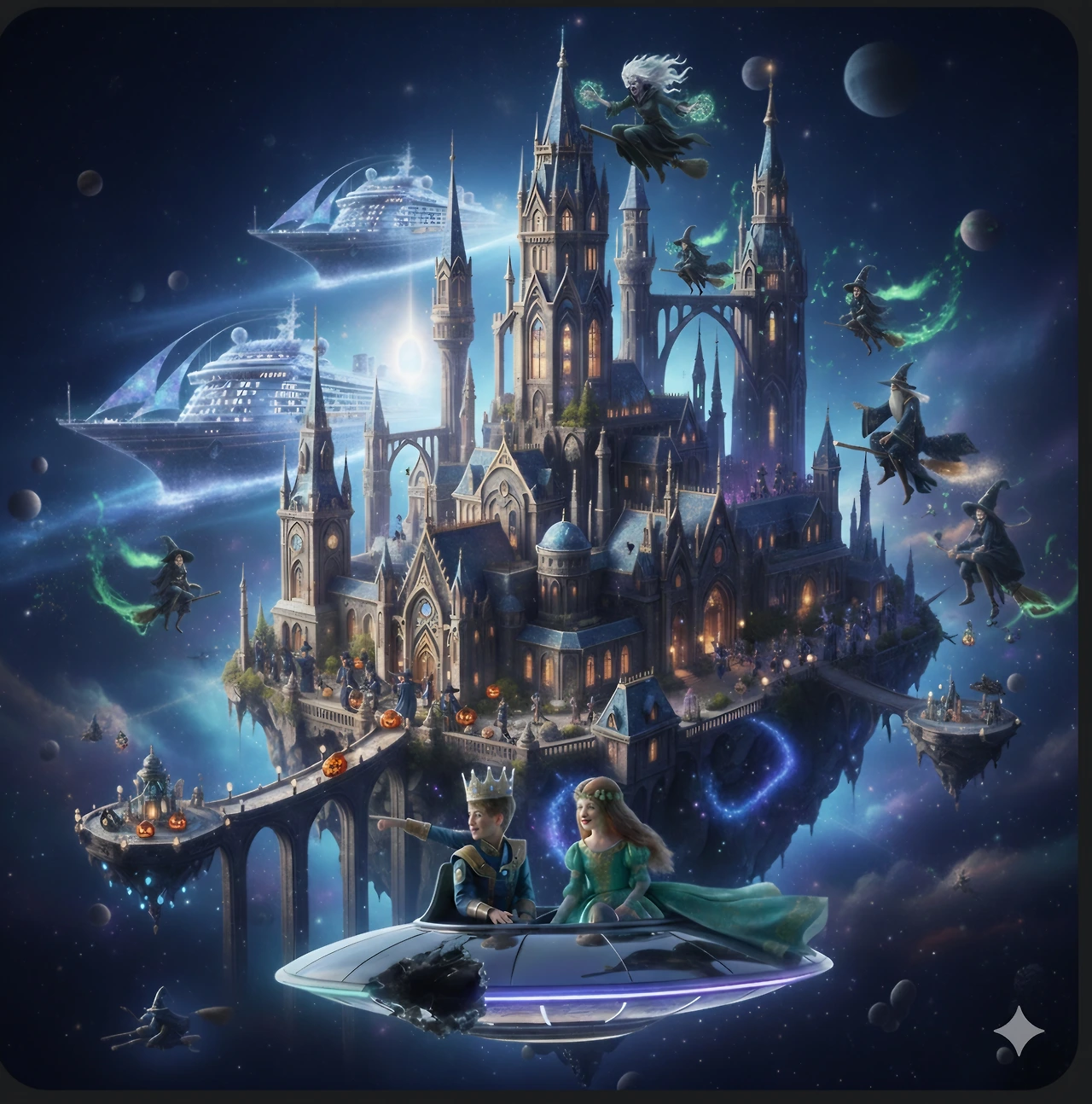 우주왕자는 비행접시를 고치기 위해 천상의 상상학교에 도착했어요.