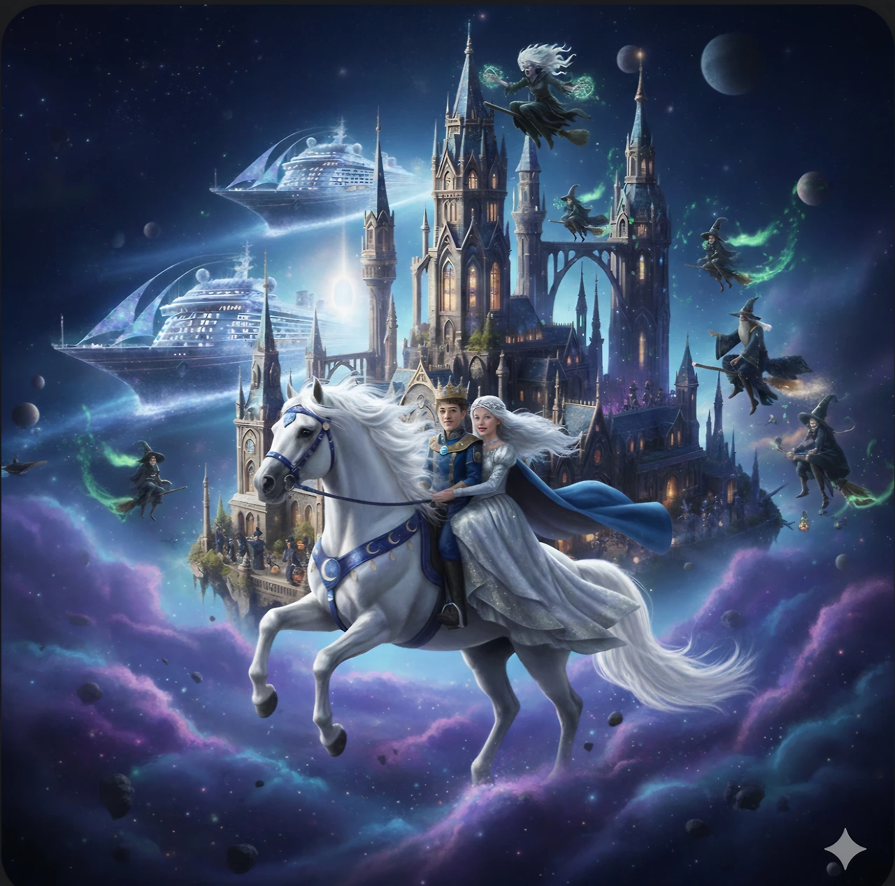 우주왕자와 달나라공주를 태운 백마는 우주공간을 돌아다니며 마법학교를 보여주었어요.