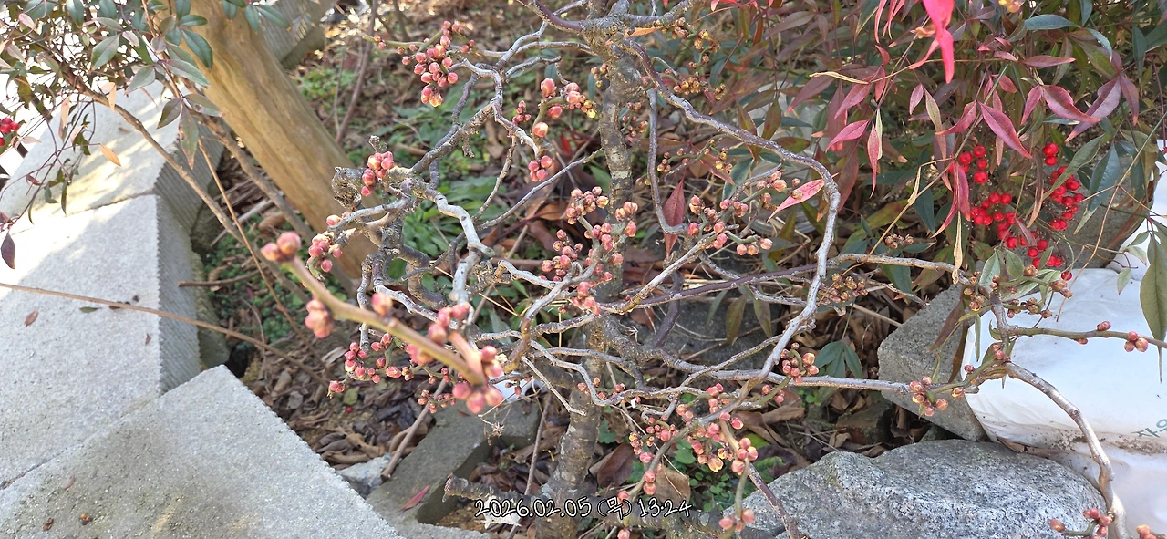 집 앞 정원의 매화분재에서 꽃망울이 올라온 걸 본 손녀가 할머니를 불렀어요.