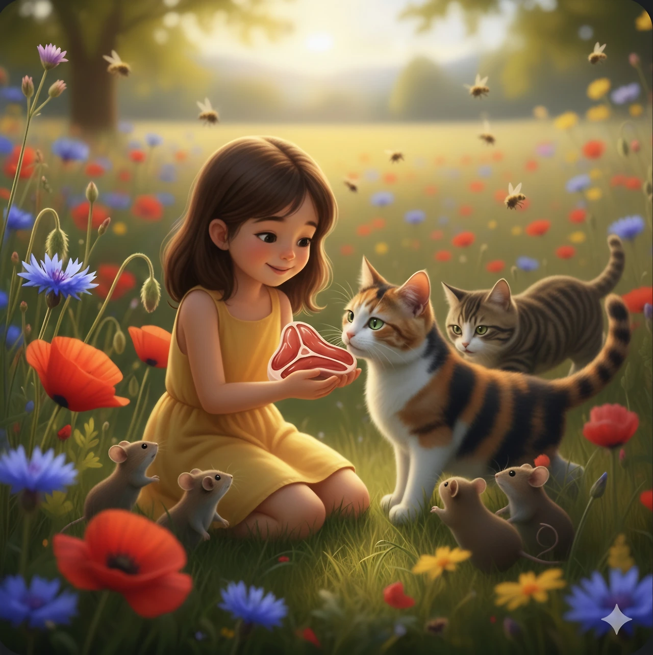 생쥐 한 마리가 말했지만 힘센 고양이들은 고기를 빼앗아 먹었어요.