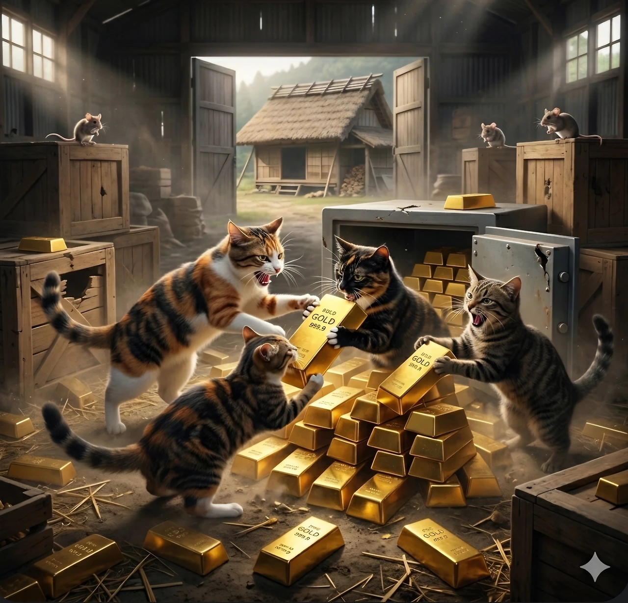 은행에서 금괴를 훔친 고양이들이 창고에 모였어요.
