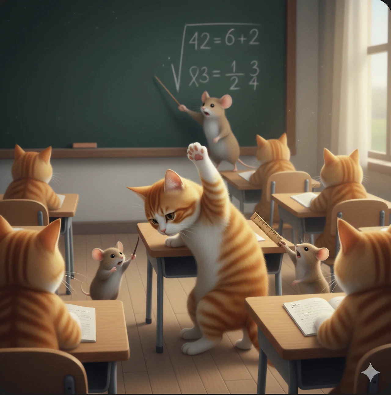 두식은 고양이학교 학생들에게 사람들이 사용하는 언어를 가르칠 계획이었어요.
