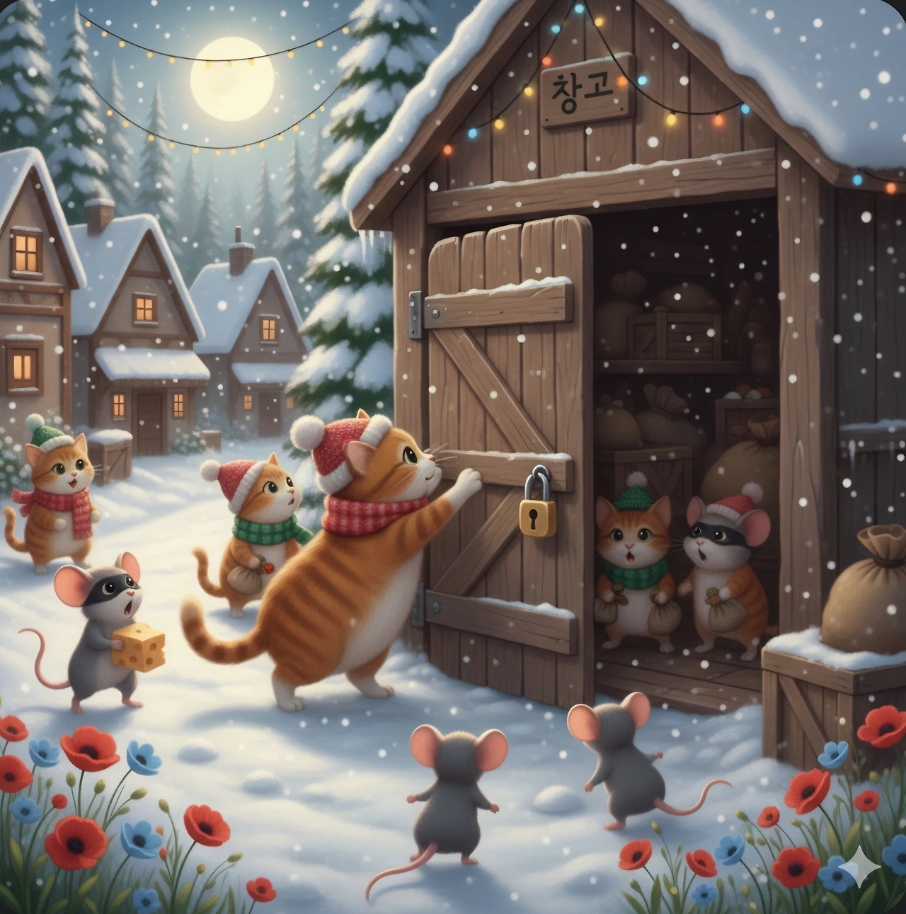 그것도 모르고 도둑고양이들은 방앗간 창고로 금고를 들고 들어갔어요.
