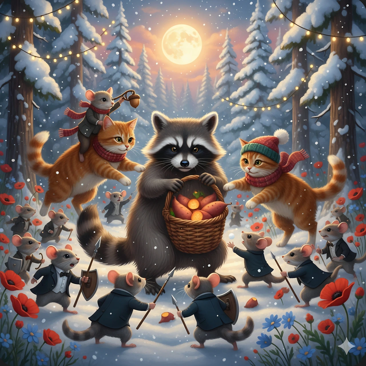 너구리는 고구마 바구니를 들고 생쥐들을 찾아다녔어요.