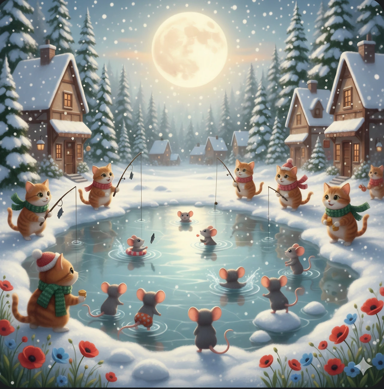 고양이와 생쥐들이 호수에서 낚시대회를 열었어요.