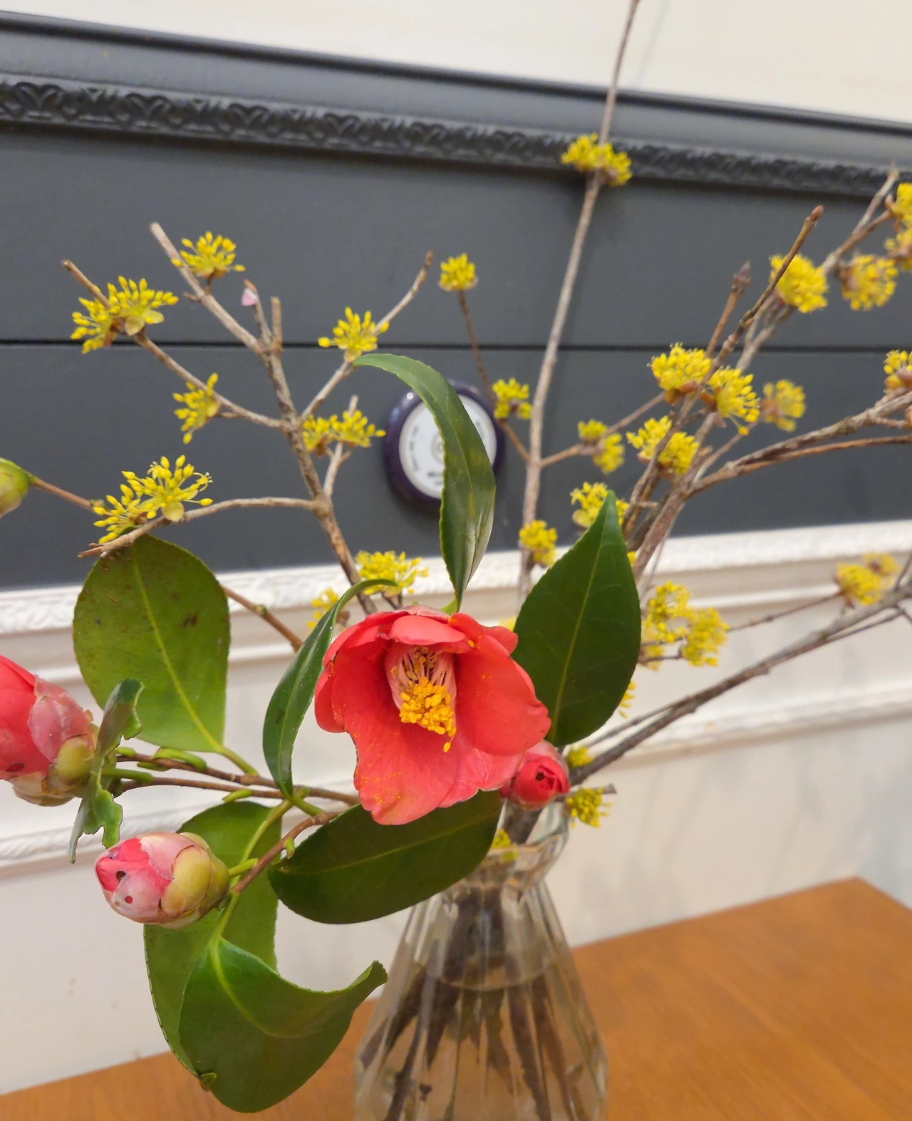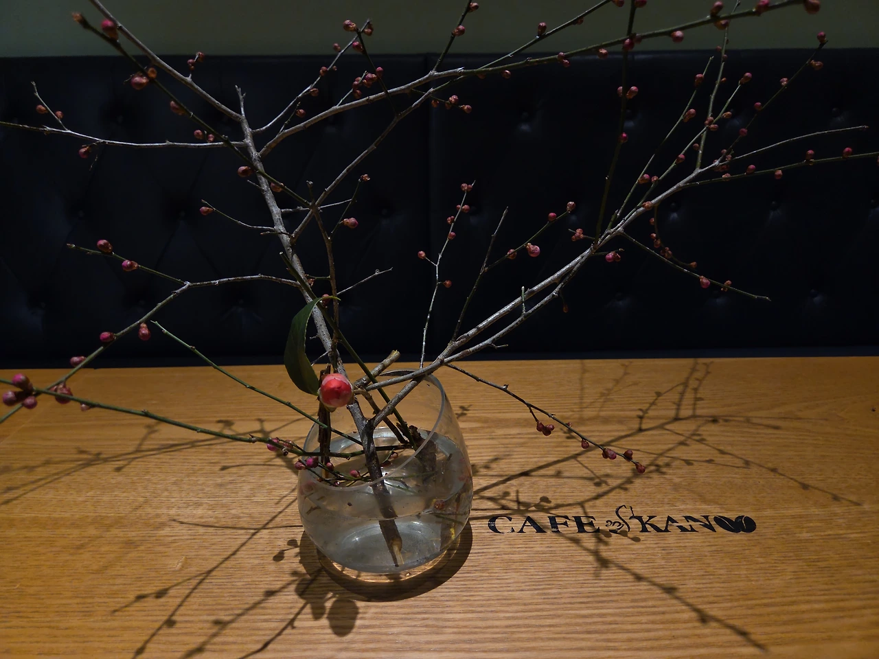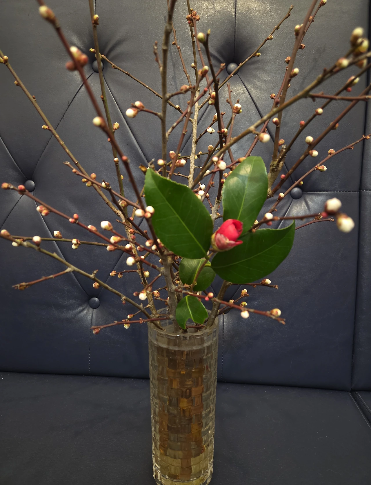 카페 <카누>에 매화와 동백이 함께 꽂혀 있었다.