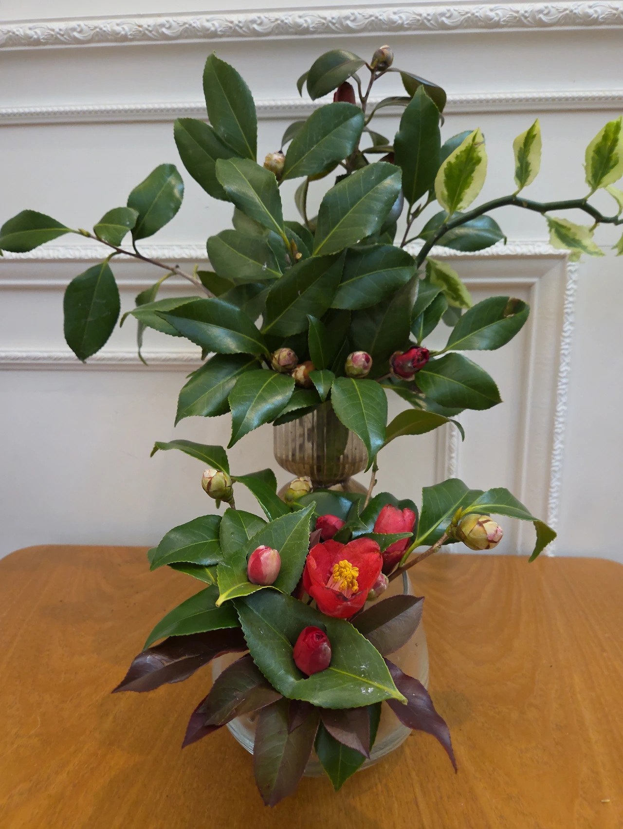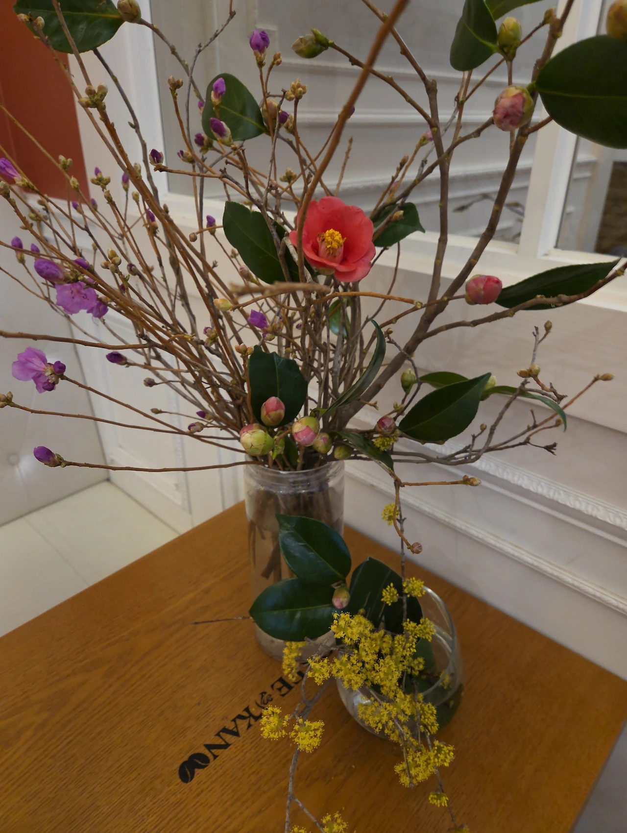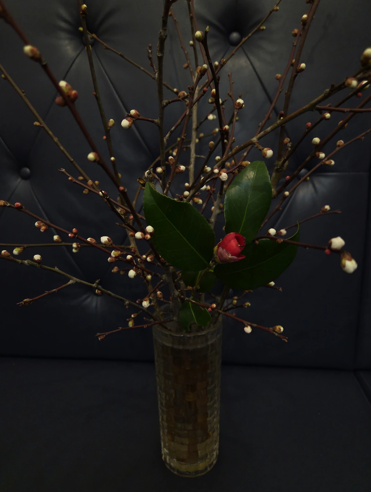 카페 <카누>에 매화와 동백이 함께 꽂혀 있었다.