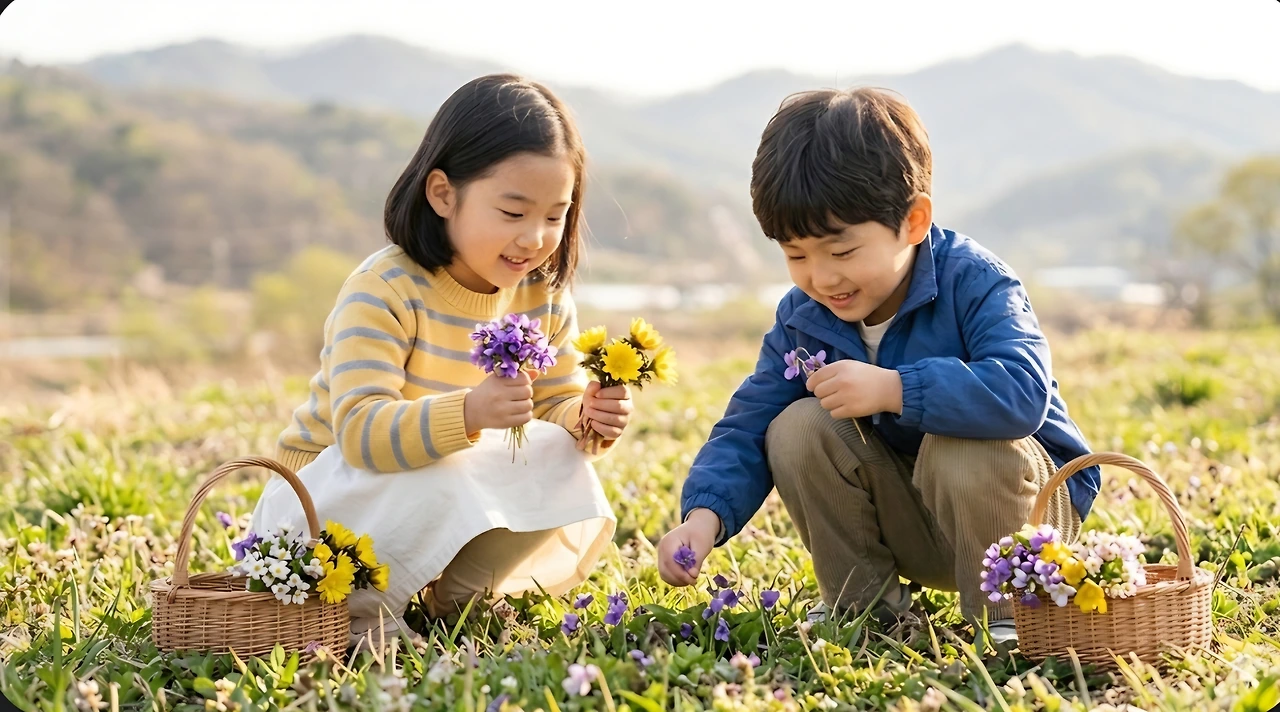 송화와 동준은 들판에서 제비꽃을 꺾으며 놀았어요.
