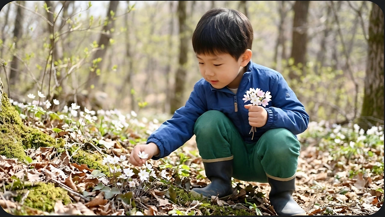 동준은 들판에서 노루귀 꽃을 찾고 있었어요.