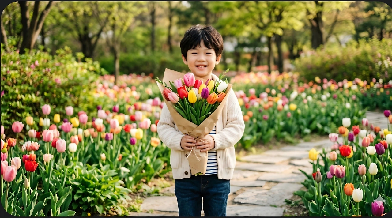 동준은 튤립 꽃다발을 들고 꽃가게를 나왔어요.