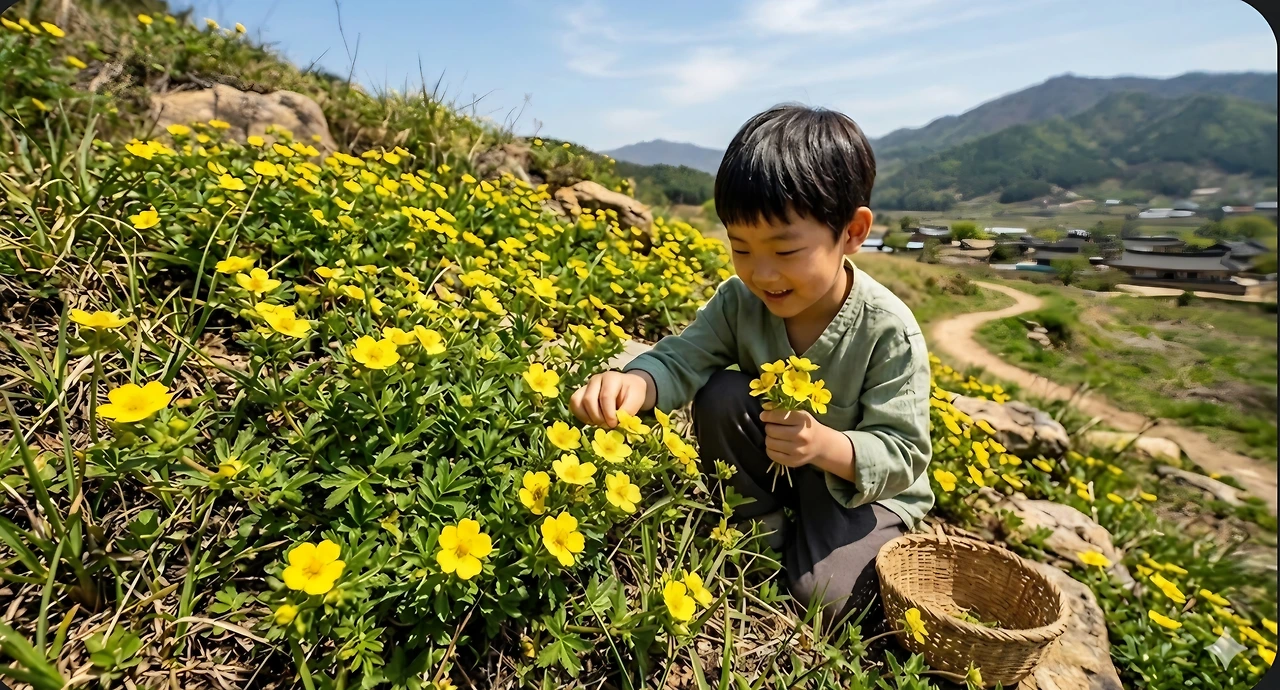 동준과 할머니는 고들빼기 꽃을 바구니에 한가득 담고 집으로 향했어요.