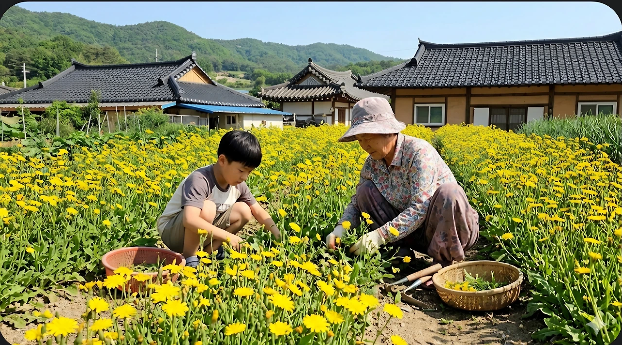 고들빼기 꽃밭에서 할머니가 꽃을 따고 있었어요.
