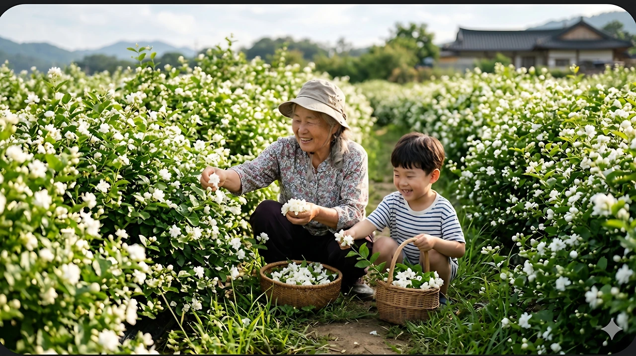 재스민 꽃밭에서 할머니와 함께 꽃잎을 따며 물어봤어요.