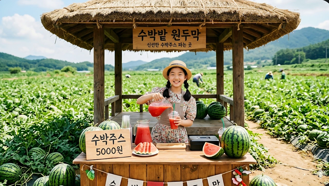 지혜는 원두막에서도 수박주스를 팔았어요.