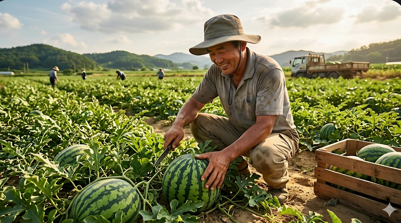 달달한 수박을 수확하기 위해 노동자들과 일하고 있었어요.