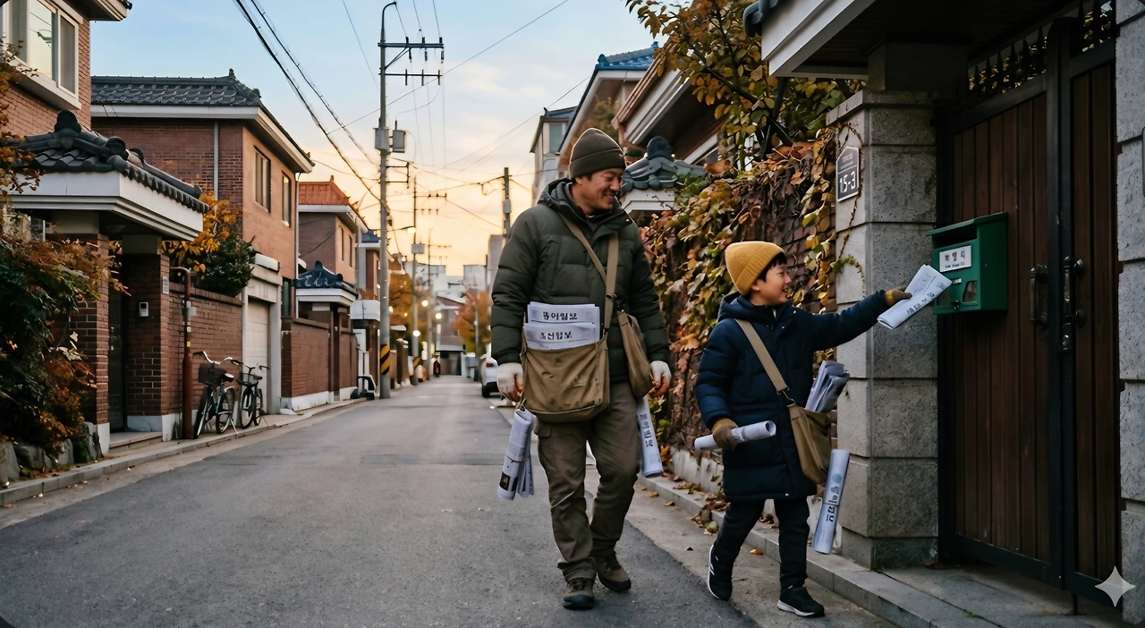 새벽 공기를 가르며 아빠와 아들이 신문 배달을 하고 있었어요.