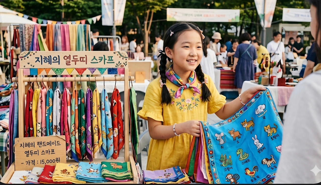 영숙은 천에 열두 띠 그림을 그려 스카프와 목도리를 만들었어요.