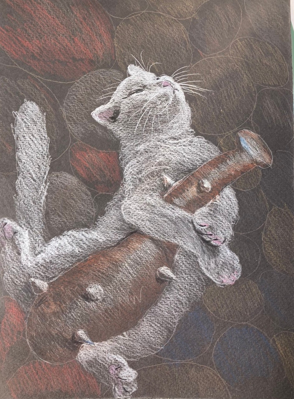 지난밤에 잃어버린 도깨비방망이를 작가가 껴안고 자고 있었어요.