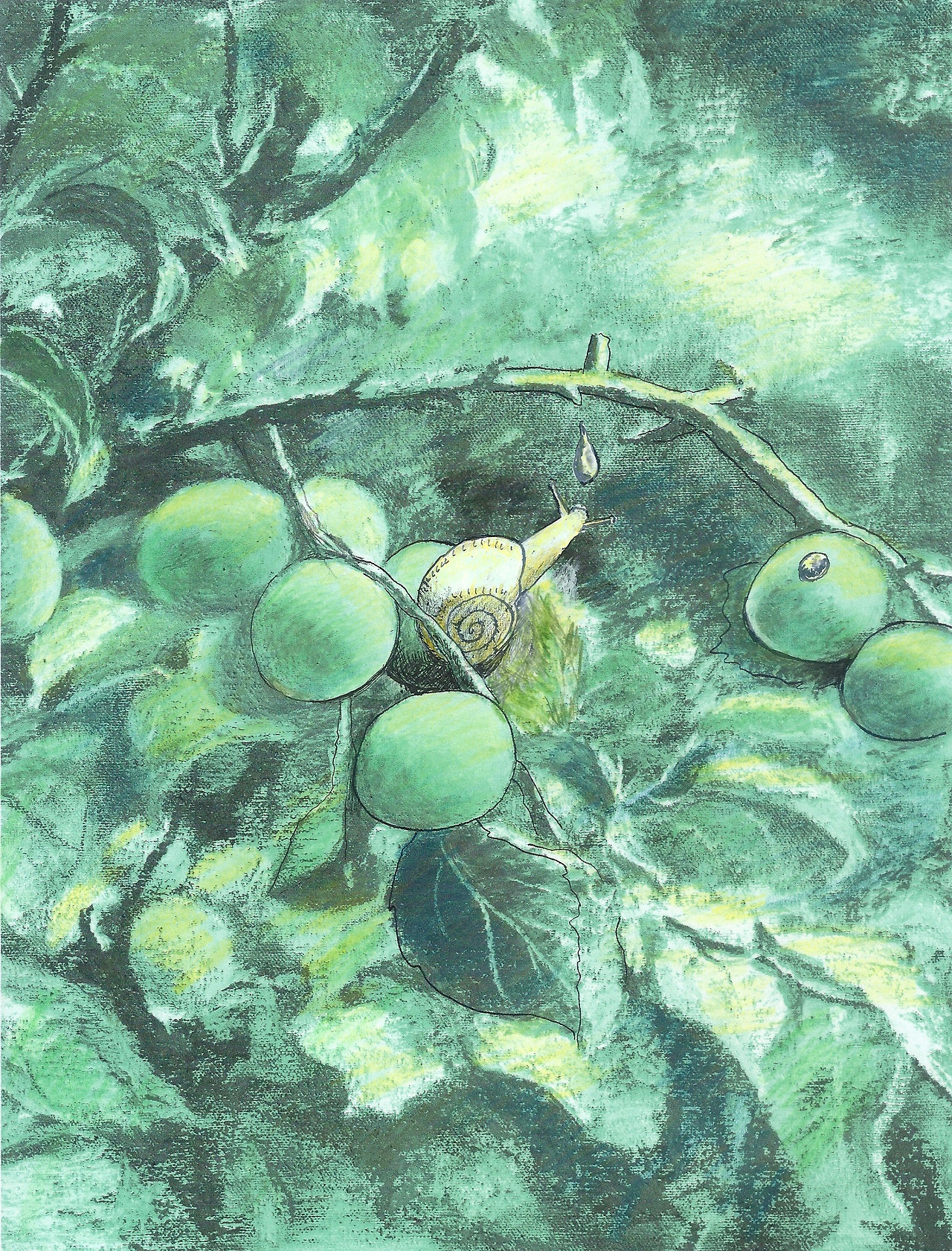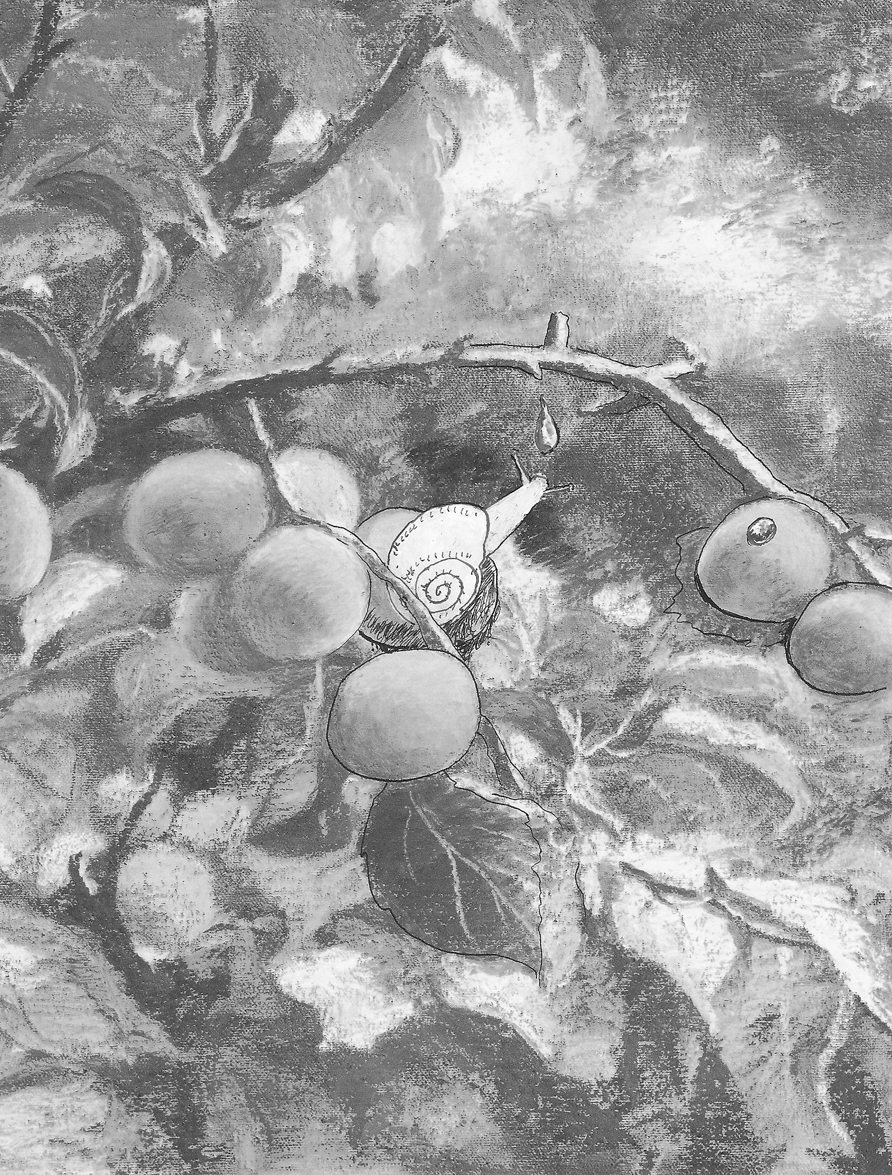 달팽이가 풀 숲을 달리자 풀잎이 흔들리며 조금 고인 이슬이 뚝 떨어졌다.