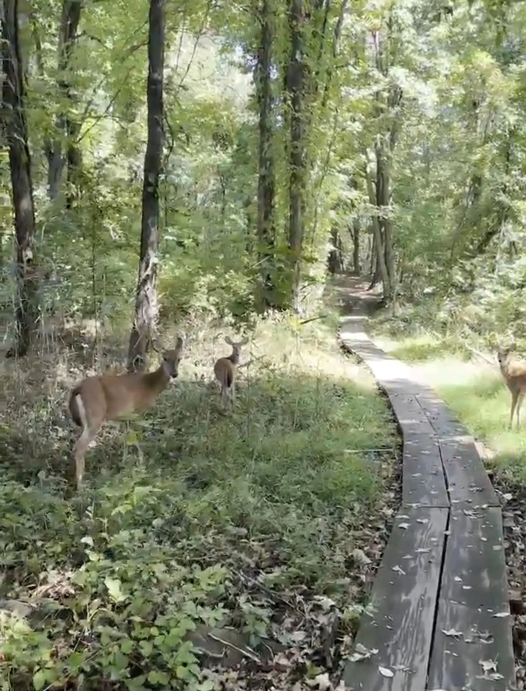 새끼 사슴과 눈을 마주치며 웃으며 걸었다.