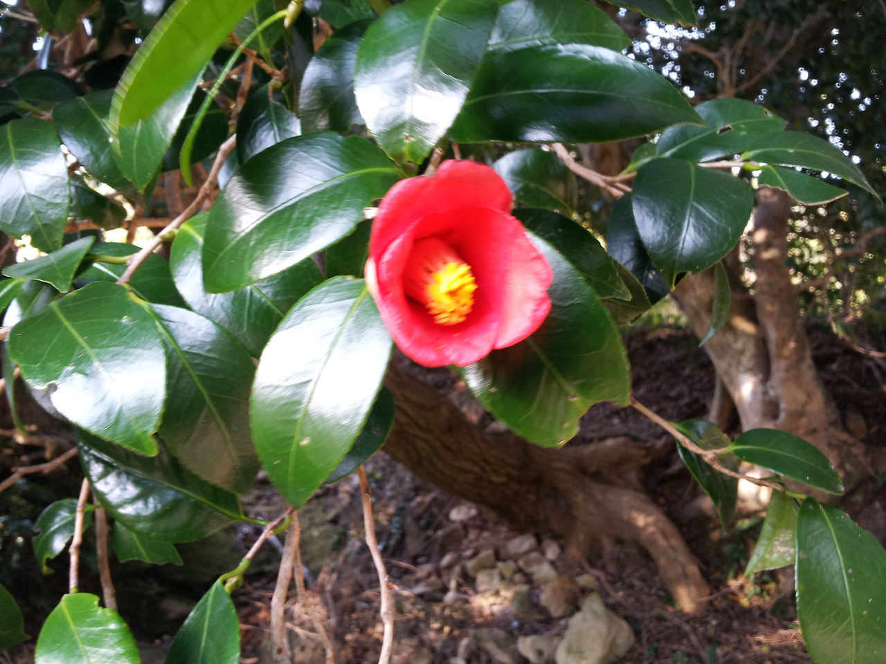 햇살에 동백나무 잎이 반짝이며 빨간 동백꽃을 더 아름답게 감싸고 있었다.