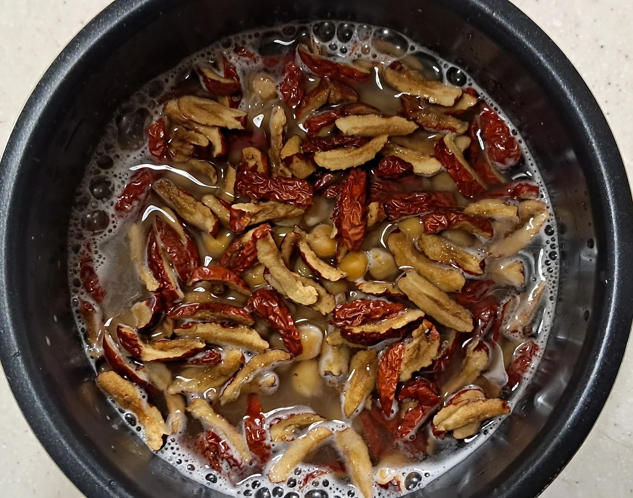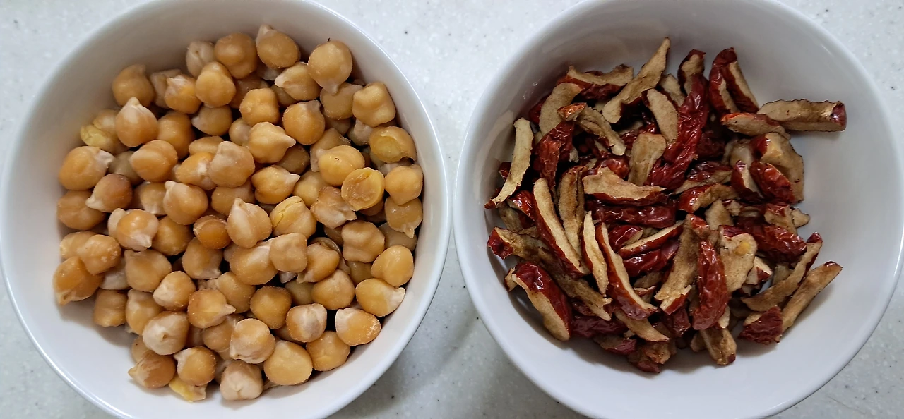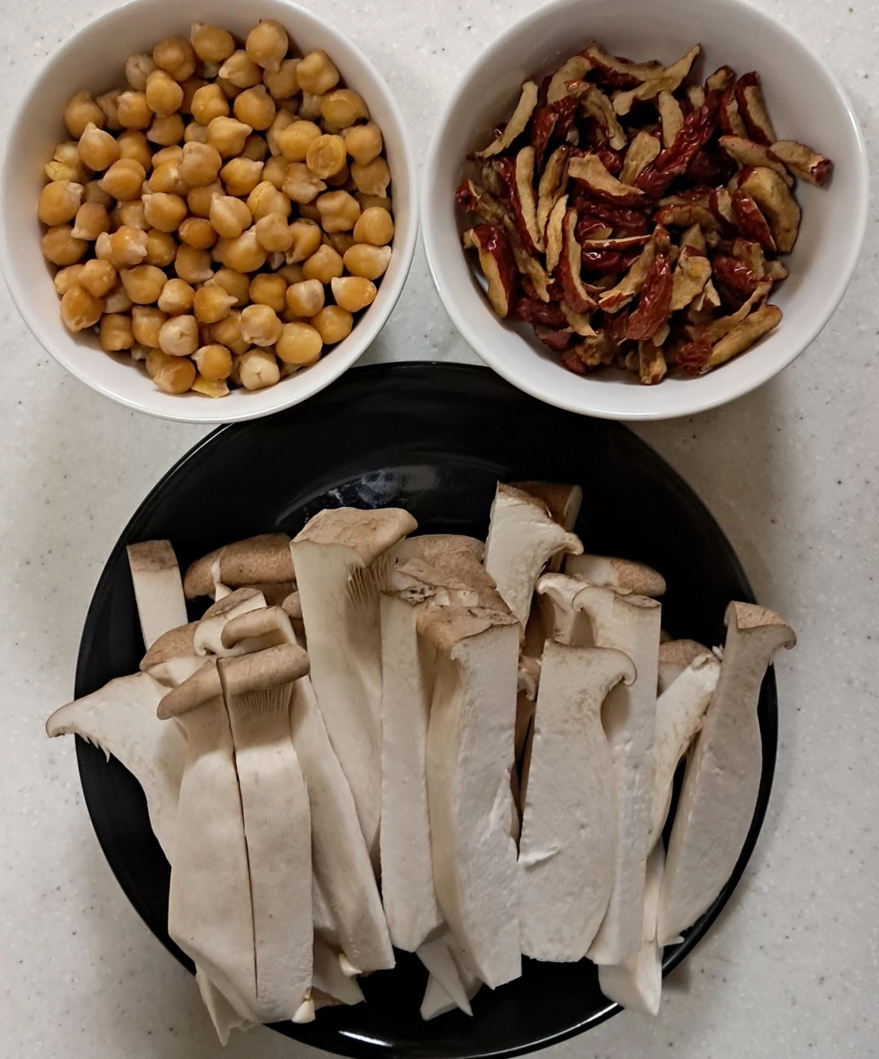 몸에 좋다는 재료인 병아리콩, 대추를 넣고 그 위에 새송이버섯을 넣어서 밥을 지을 생각입니다."