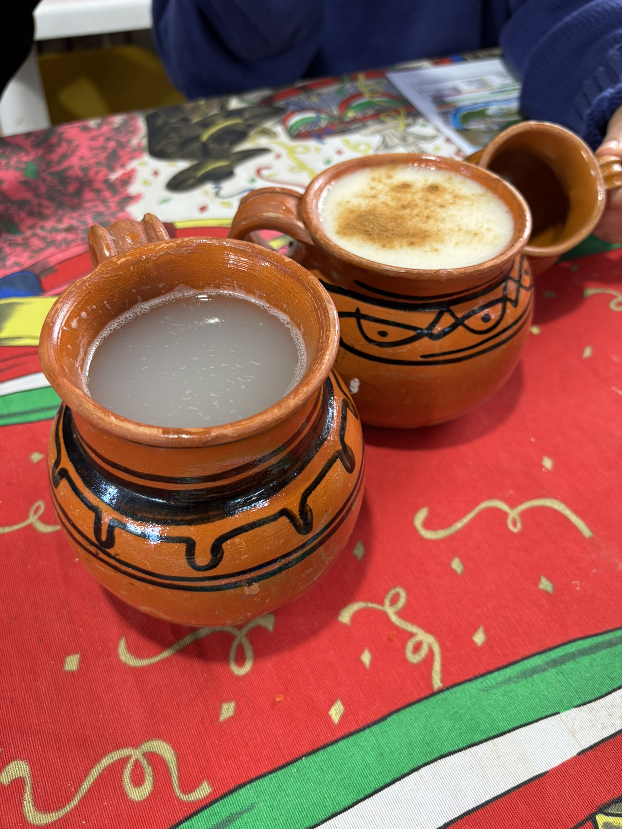 곧 나온 퀘사디아와 뿔께. "뿔께(Pulque)"는 멕시코 전통 술로, 우리나라 막걸리와 비슷한 발효주인데, 특유의 시큼하고 쿰쿰한 향으로 호불호가 갈린다. 그렇기 때문에 과일을 추가하기도 하는데, J와 나는 처음 시도하는 터라 오리지널을 주문했고, 다른 일행은 멕시코 인턴 생활을 통해 뿔께에 대해 어느 정도의 사전 지식이 있던 터라 구아바 뿔께를 주문했다.