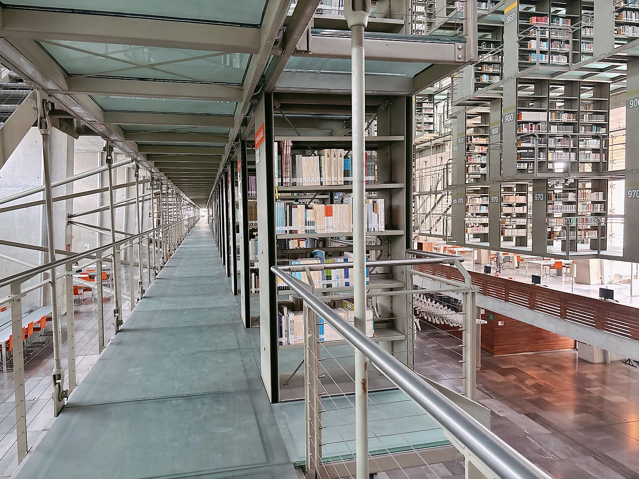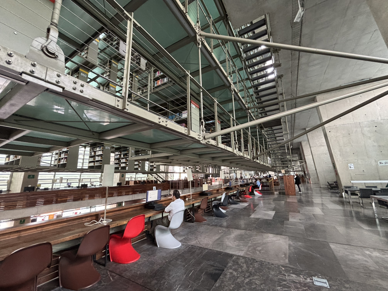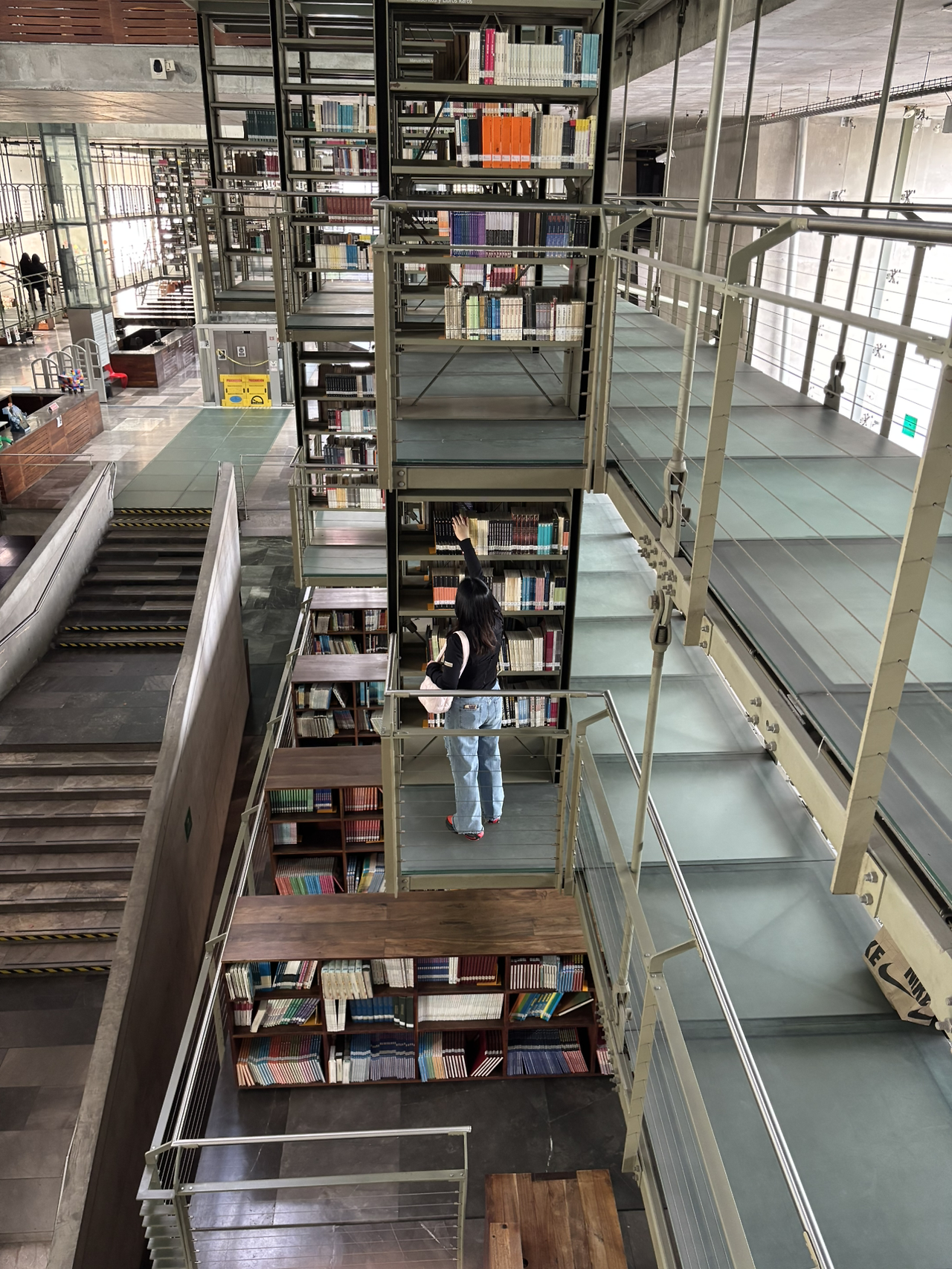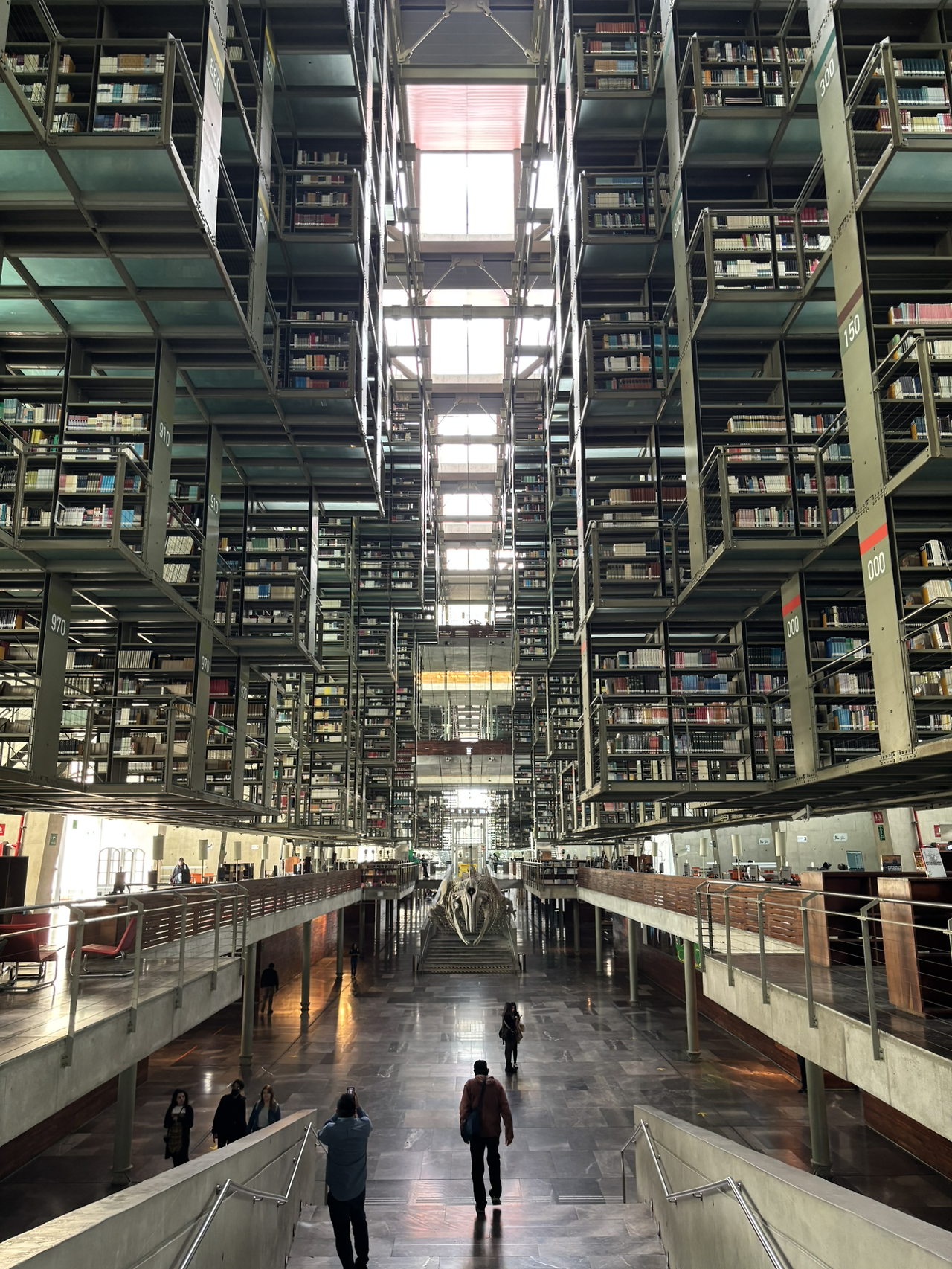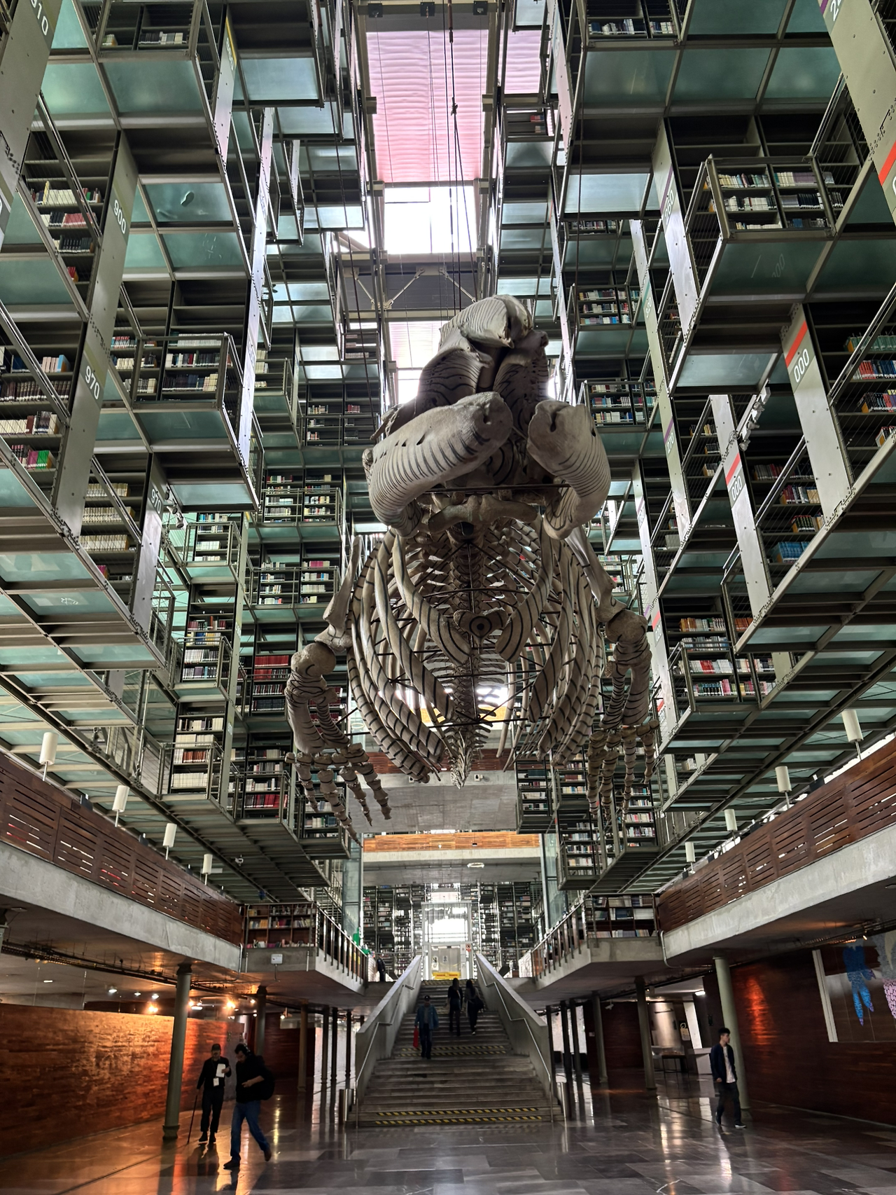 "바스콘셀로스 도서관(Biblioteca Vasconcelos)"은 멕시코시티를 대표하는 공공 도서관 중 하나로, 영화 <인터스텔라>의 배경지로도 잘 알려져 있다. 과연 들어가자마자 감탄이 나올 정도로 압도적인 공간이 펼쳐지는데, 천장 가까이까지 뻗은 금속 프레임 서가들이 공중에 층층이 매달려 있고, 중앙에는 거대한 고래 뼈 모양의 조형물이 설치되어 있었다. 이러한 독특한 구조 덕에 멕시코시티 건축 명소로도 손꼽히며, 도서관 특유의 묵직한 고요함과 어우러져 웅장하면서도 위압적인 분위기를 느낄 수 있었다.
