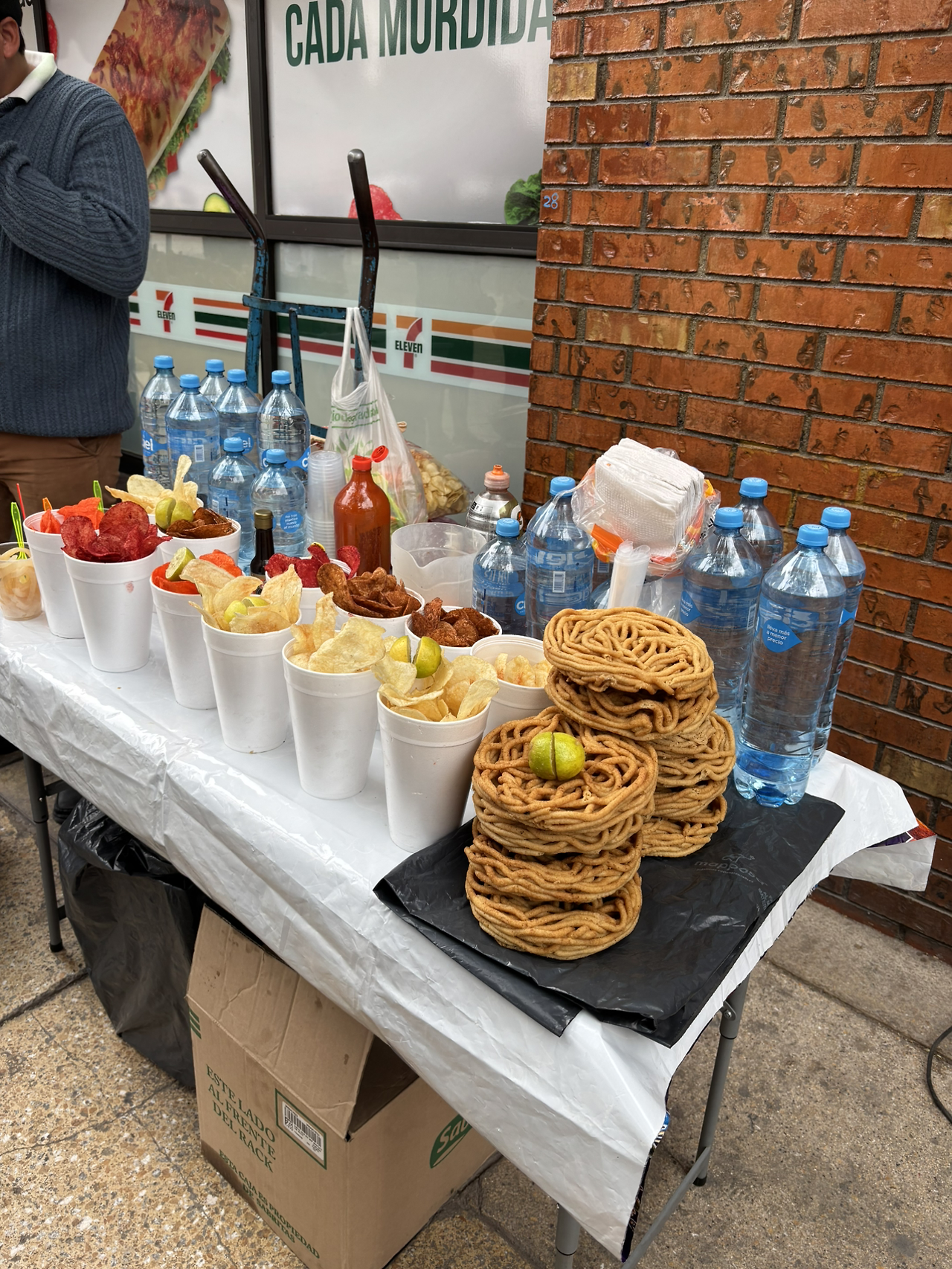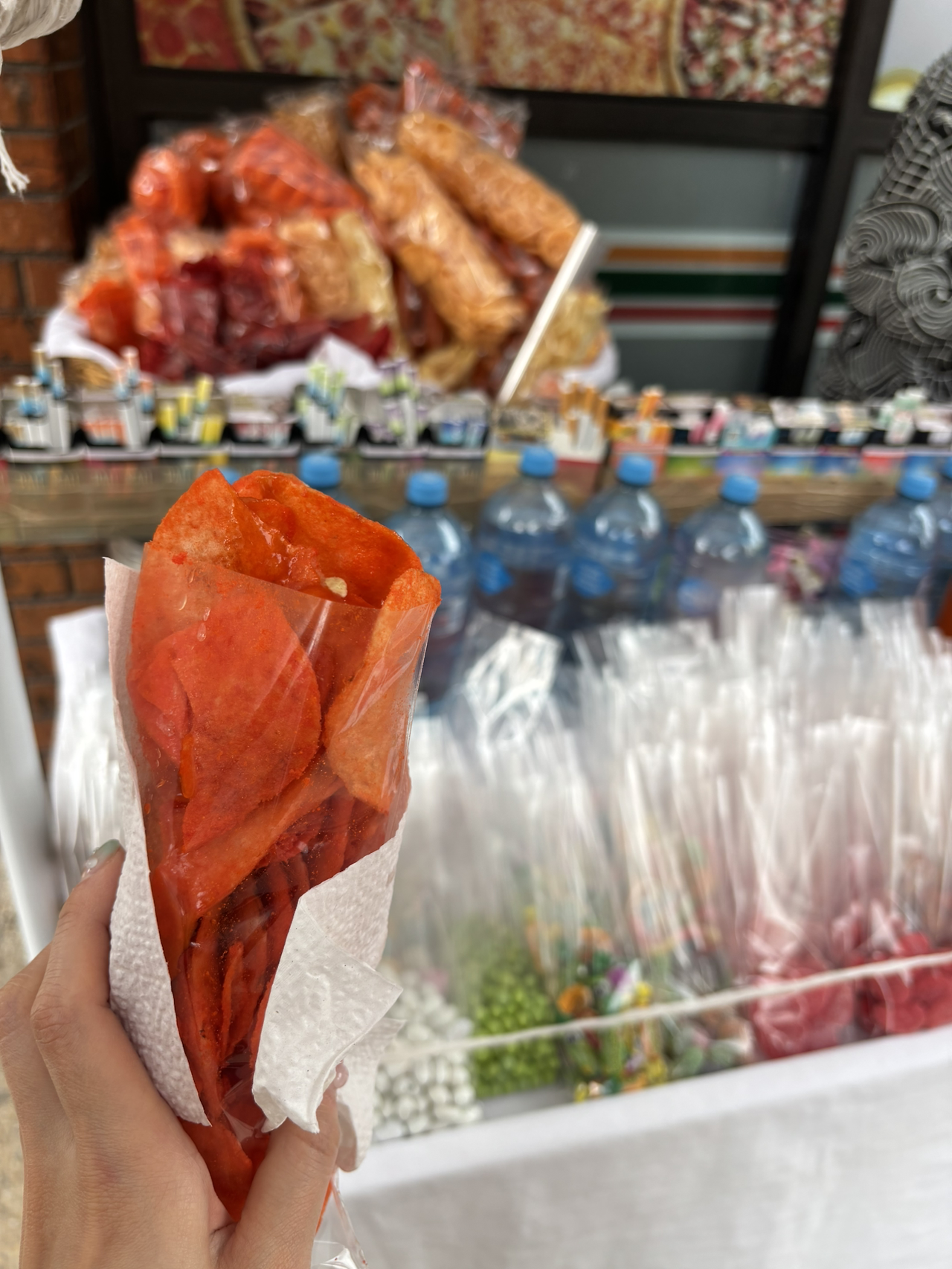 길거리 간식 중 도리토스 같은 감자칩에 라임과 각종 소스를 추가해 먹는 것이 있었다. 현지인들이 꼭 하나씩 손에 들고 다니기에 어떤 맛일까 계속 궁금했었는데, 이 날 한 번 시도해 보기로 했다. 마침 아까 사진을 찍은 혁명기념비 근처 광장에서 다들 털썩 앉아 무언가 하나씩 먹고 있어서, 우리도 이 미지의 간식을 사들고 합류했다.