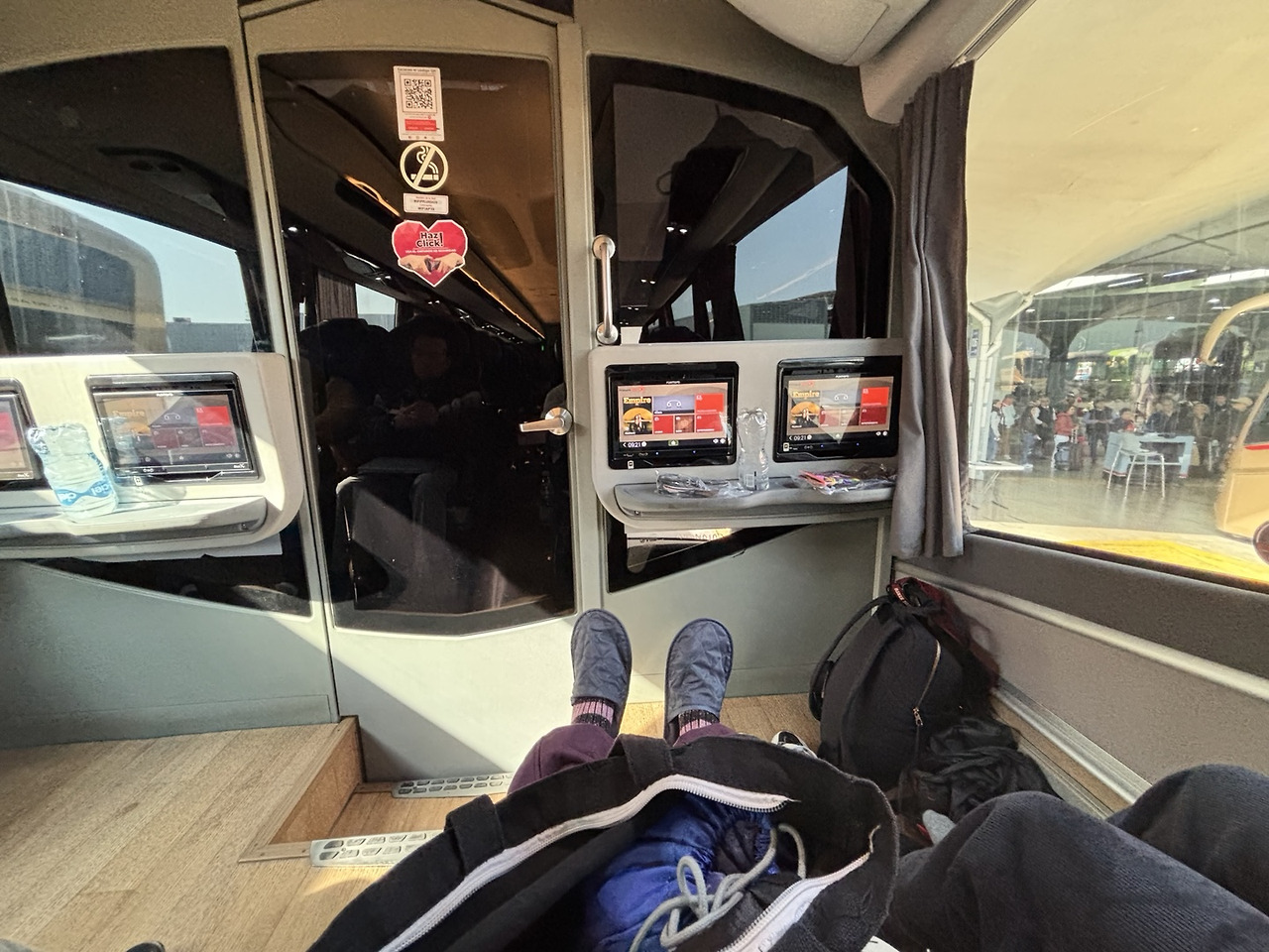 버스에 오르자마자 '우등'버스인 이유를 단번에 알 수 있었다. 널찍한 좌석 간격, 좌석마다 달린 개인테이블과 태블릿, 일회용품, 리클라이닝 시트에 커다란 창문까지. 우리는 맨 앞 좌석을 예약했는데, 다리는 충분히 뻗을 수 있었지만 오히려 앞 공간이 너무 넓어서 불편했다. 앞에 둔 짐과 간이테이블에 손이 닿지 않았기 때문이다.