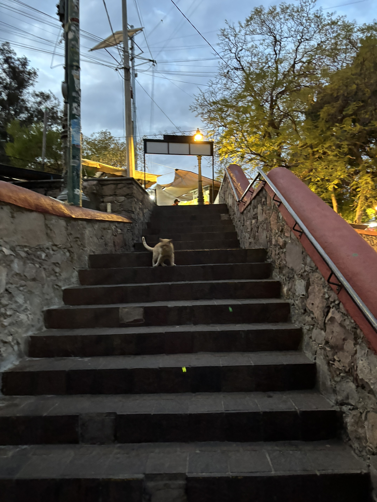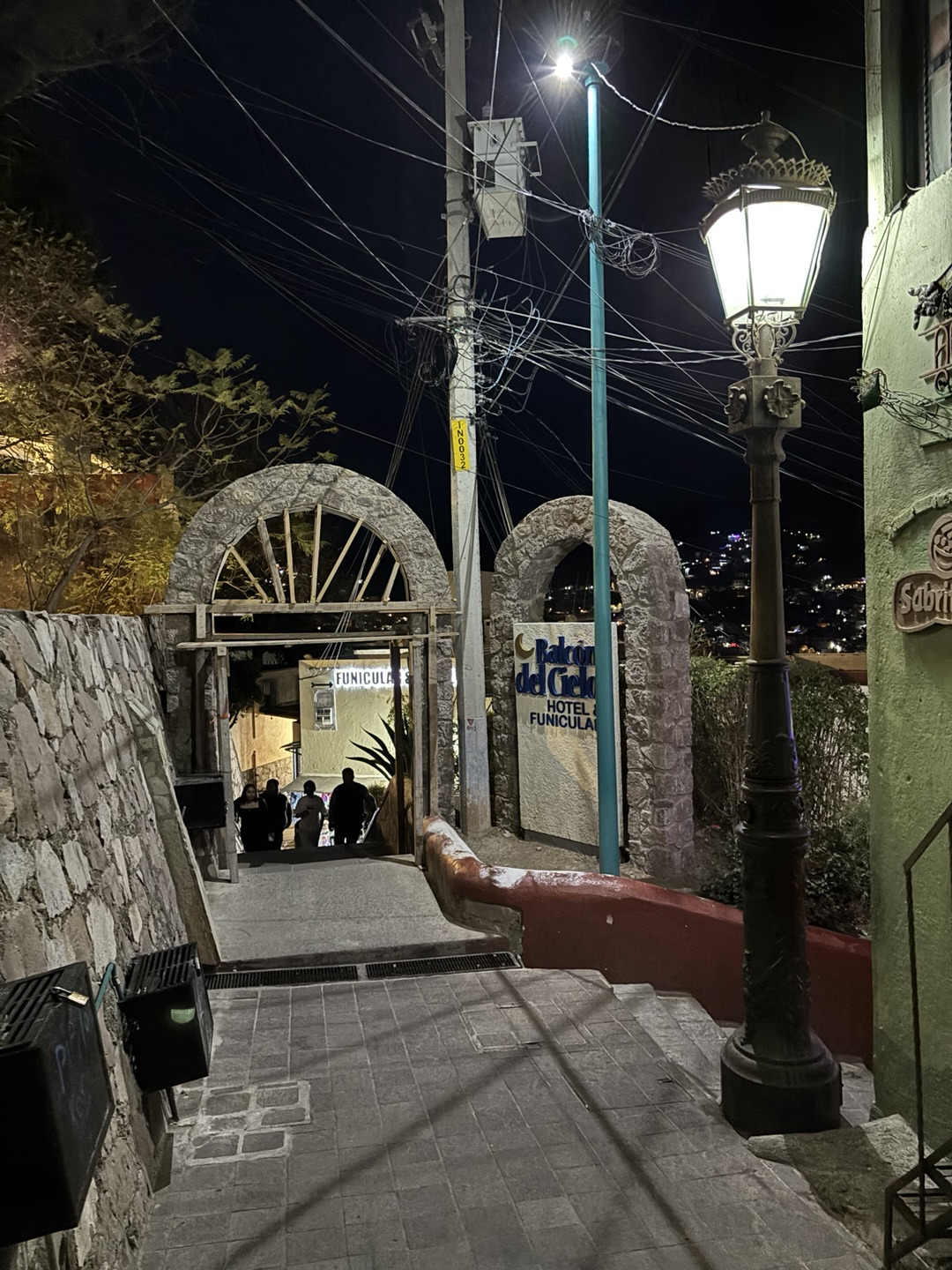만족스러운 식사를 마치고, 과나후아토의 대표 관광지인 “삐삘라 전망대(Monumento Al Pipila)”에 야경을 보러 가기로 했다. 푸니쿨라를 타는 방법도 있지만, 우리는 소화도 시킬 겸 걸어가기로 했다. 도보로 15~20분 정도 걸리는 거리로 아주 길진 않지만, 경사가 상당히 가파르다. 무엇보다 올라가는 길이 후미진 골목길이라서 조금 긴장했는데, 다행히도 가파른 길을 헐떡이며 오르던 유쾌한 외국인 관광객들과 만나서 어둑어둑한 골목길을 치안 걱정 없이 올라갈 수 있었다. 물론 경사는 정말 쉽지 않았다...
