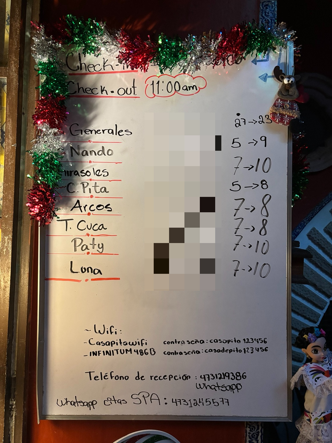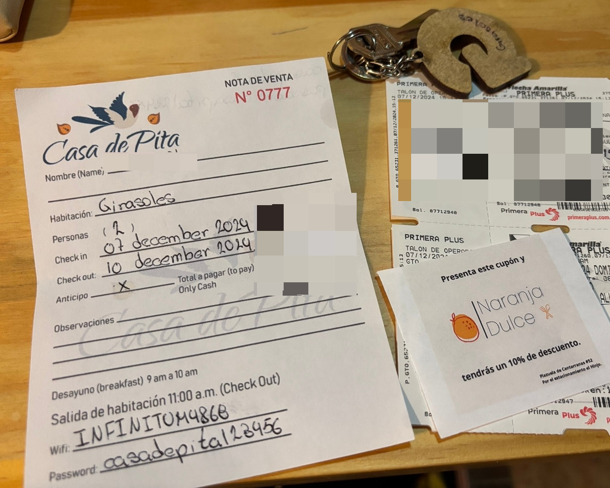 벽 한구석의 화이트보드에는 투숙객 명단이 적혀 있었고, 비슷한 글씨체로 쓰인 확인서를 받았다. 제휴 식당인 “Naranja Dulce”의 10% 할인 쿠폰도 받았는데, 아쉽게도 가보지는 못했다.