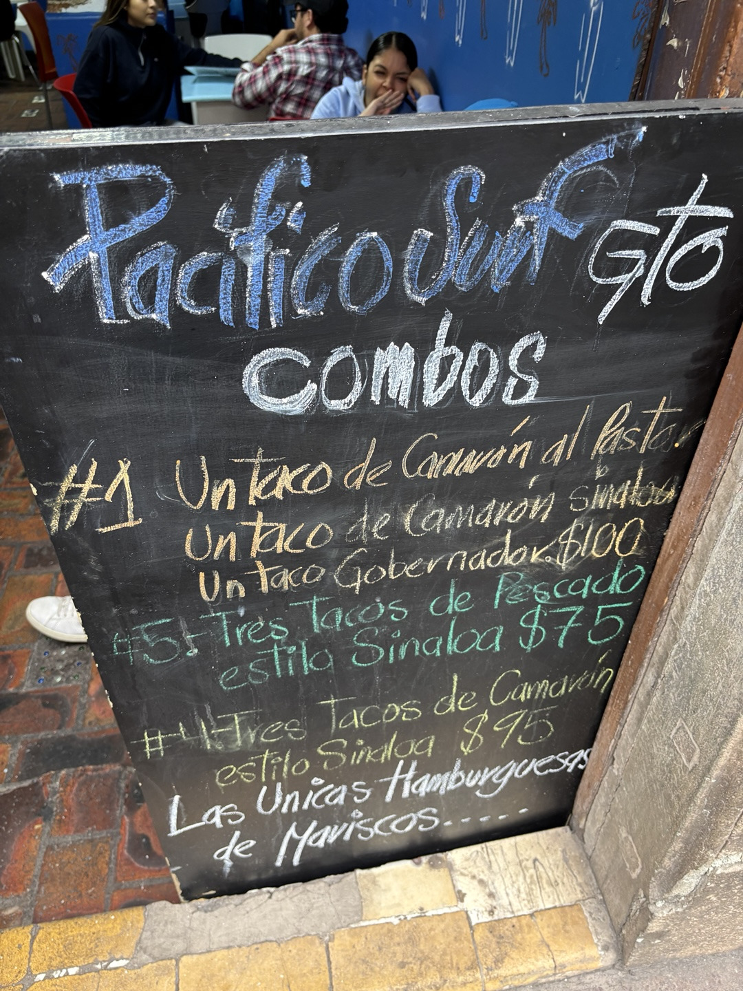멕시코시티에서는 고기가 들어간 요리만 접했지만, 사실 새우나 생선 등 해산물이 들어간 타코가 더 궁금했다. 그만큼 ‘해산물 타코 맛집’ 키워드로 검색도 여러 번 했고, 가장 많이 언급될 뿐 아니라 구글 평점도 나쁘지 않은 곳이 바로 이곳, 과나후아토의 “Pacifico Surf Antojería Del Mar”였다. 이제껏 찾아간 맛집들에 실망한 경험이 대다수였지만, 이곳만큼은 너무 궁금해서 망설임 없이 방문했다.
