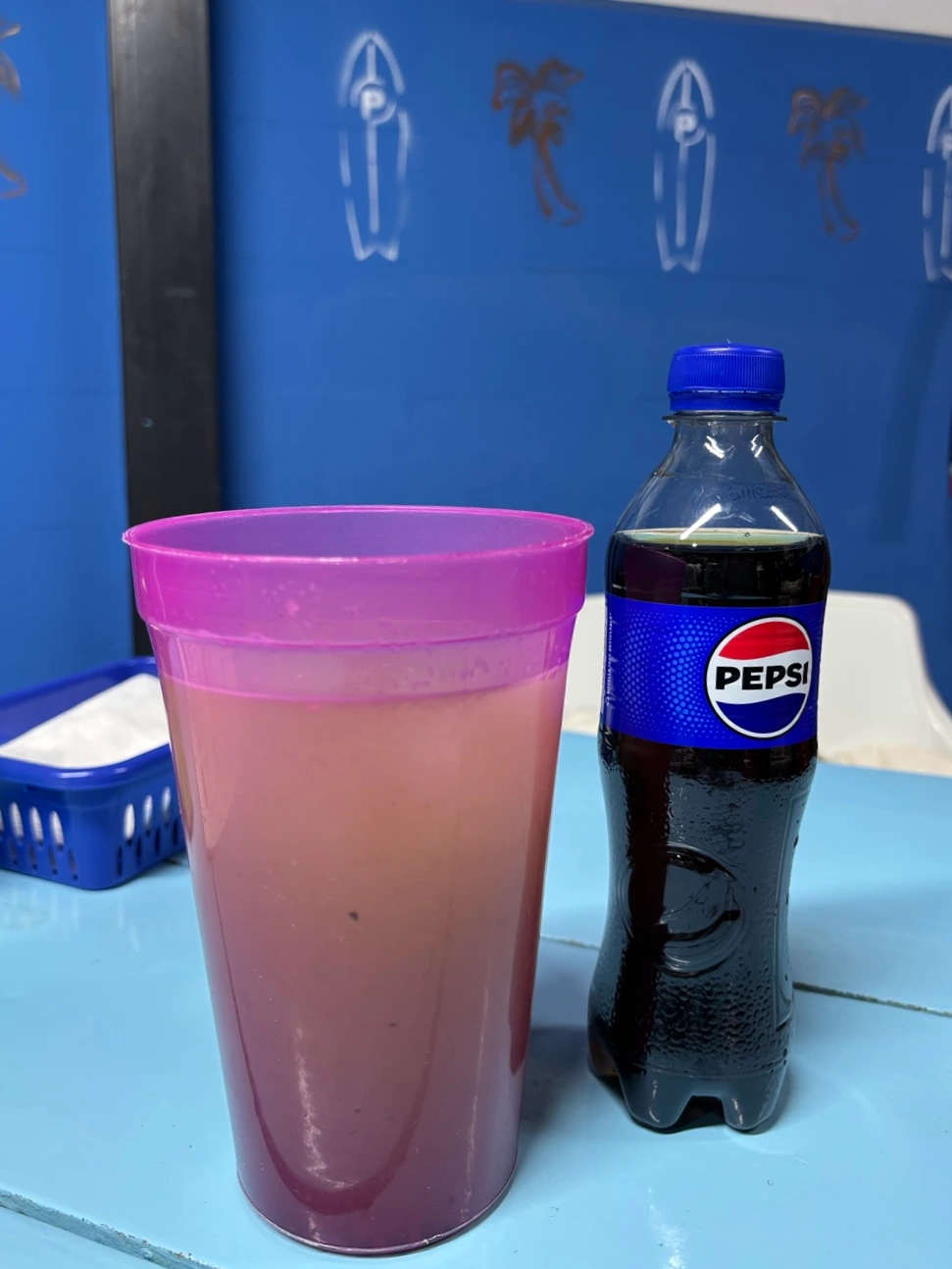 토핑이 듬뿍 들어간 햄버거와 감자튀김. 맥주가 생각나는 메뉴들이었지만 어젯밤 과음한 감이 있어서, 콜라와 “AGUA DE SABOR”라는 음료를 주문했다. 사진에서는 다소 작아 보이지만, 과장 보태지 않고 컵 사이즈가 내 얼굴보다 컸다. 정말 멕시코 대형사이즈 하나는 알아줘야 한다. 정확히 어떤 음료인지는 아직 모르겠지만, 상큼한 과일이 몇 가지 섞인 맛이었다.