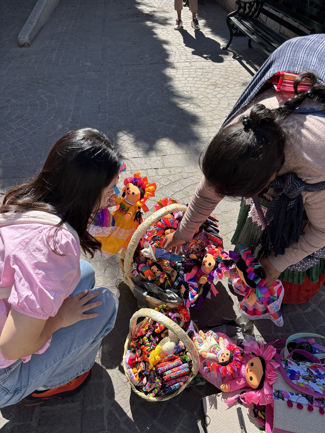 상점가 밖으로 나오니 하늘이 더 선명하게 파래져 있었고, 덕분에 일요일 낮 특유의 푸근한 분위기가 더 살아났다. 걷다 보니 예쁜 핑크색 성당이 눈에 들어왔는데, 이곳에서 가장 유명한 산미겔 아르칸헬 교구성당은 아니지만, 나름 규모가 크고 주변에 작은 공원도 조성되어 있었다. 공원 분수대 주변에서는 아이들이 뛰놀고 있었고, 예쁜 멕시코 전통 인형을 파는 길거리 노점상이 있었다. J는 인형을 구경하다가 고심 끝에 선물용으로 하나 구입했다.