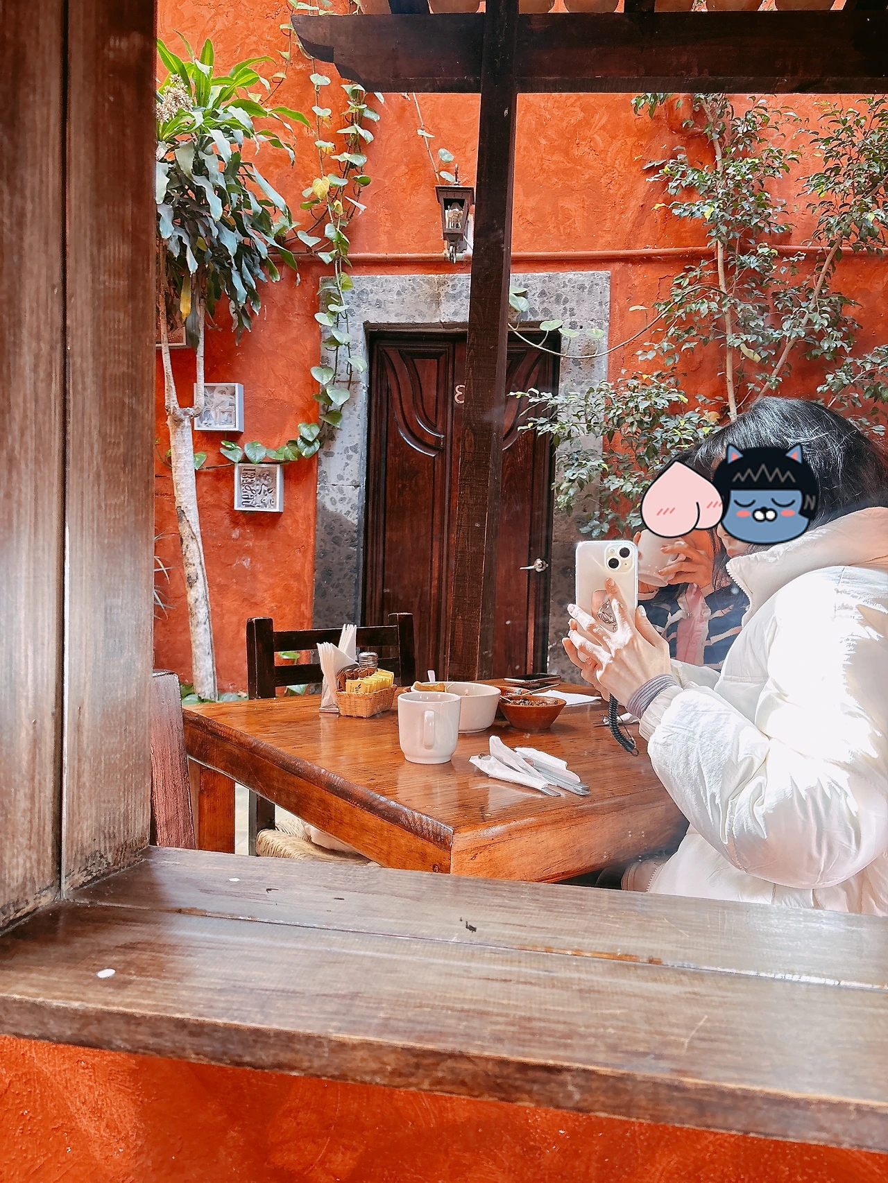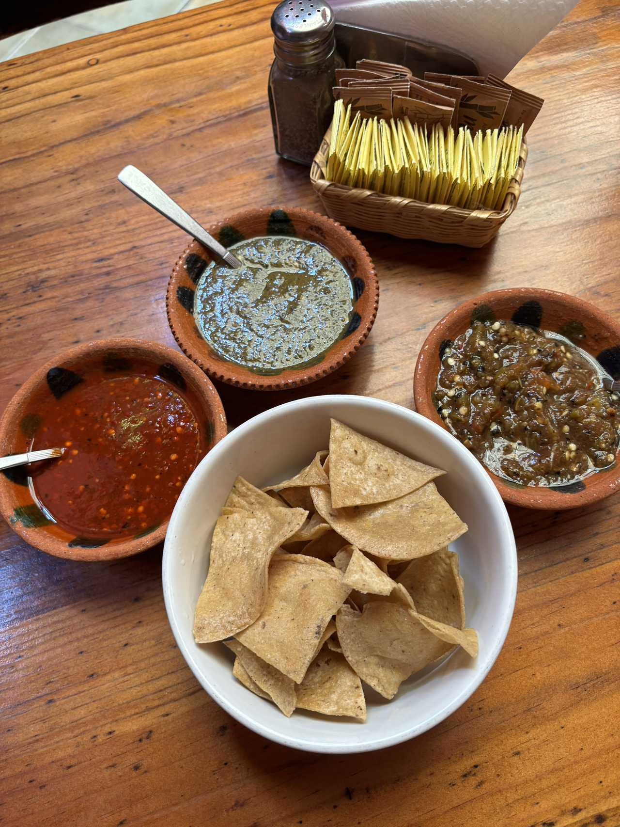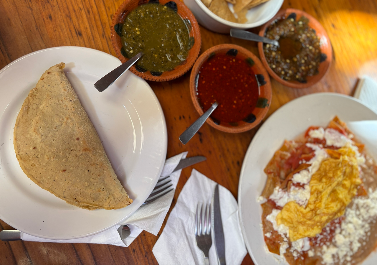 이 날 아침 메뉴로는 퀘사디아 하나와, “칠라낄레스(Chilaquiles)”라는 새로운 메뉴를 주문해 보았다. 칠라낄레스는 또띠아를 삼각형으로 잘라 튀긴 후, 소스와 재료를 얹어 먹는 멕시코 전통 아침식사 메뉴다. 해장용으로도 먹는다고 하는데, 이날 우리가 먹은 오믈렛이 올라간 칠라낄레스는 확실히 해장용은 아니었다.