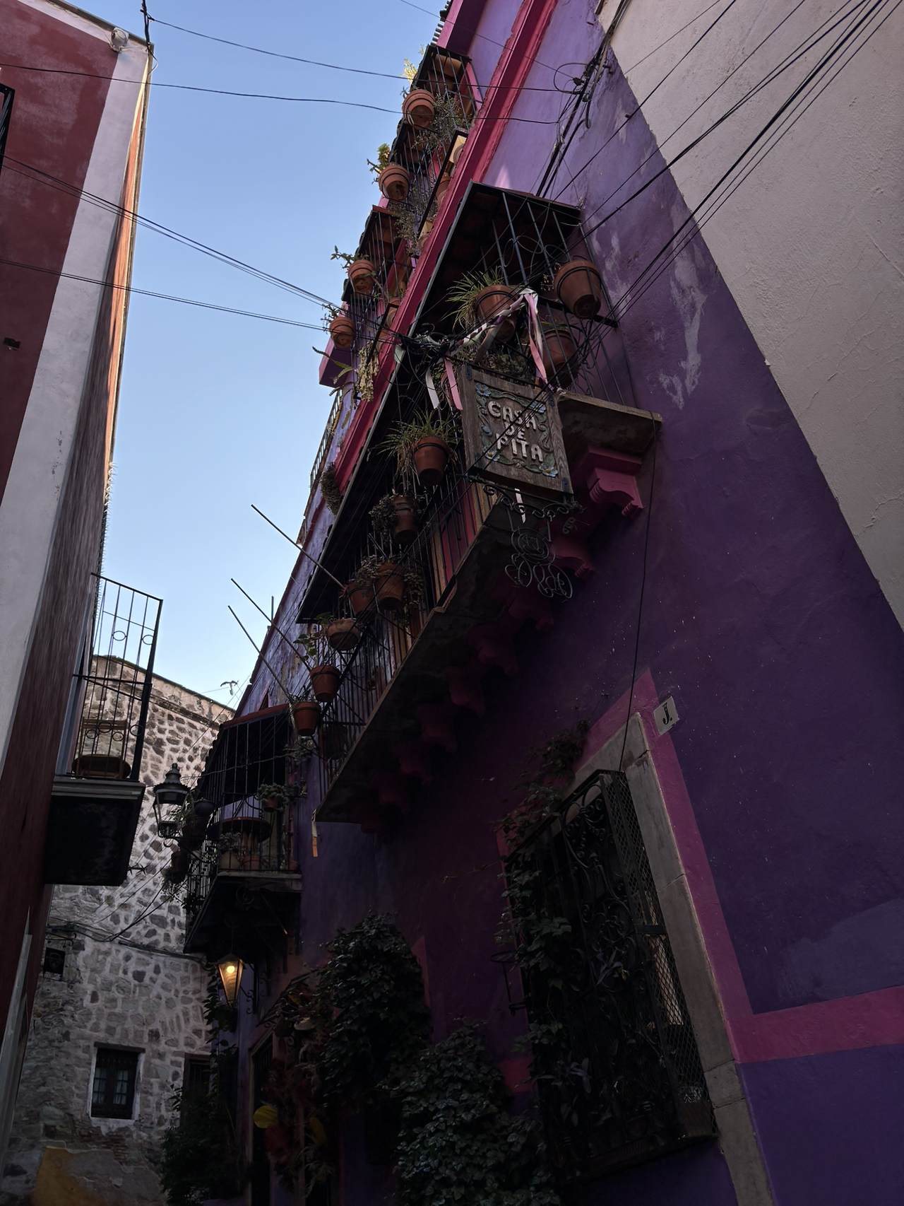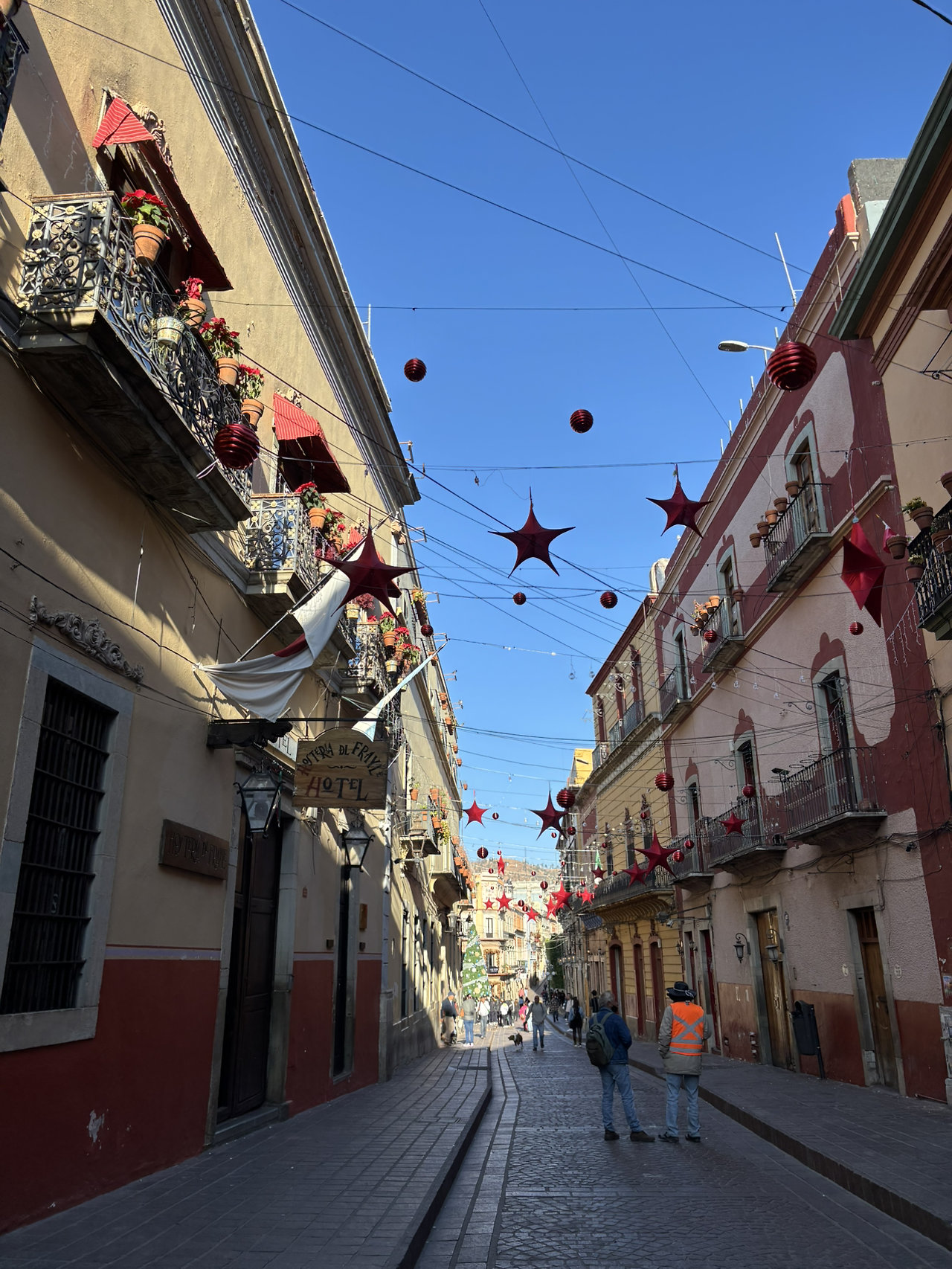 삐삘라 전망대를 오갈 수 있는 푸니쿨라 탑승장에서 후아레즈 극장으로 이어지는 길은 과나후아토에서 가장 많이 지나다녔던 길목이다. 사진첩을 봐도 빨간 별과 구 모양의 장식물이 대롱대롱 달려있는 이 거리 사진이 제일 많다.