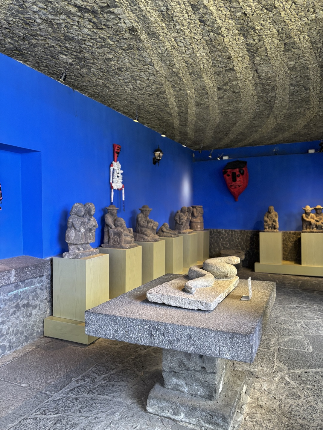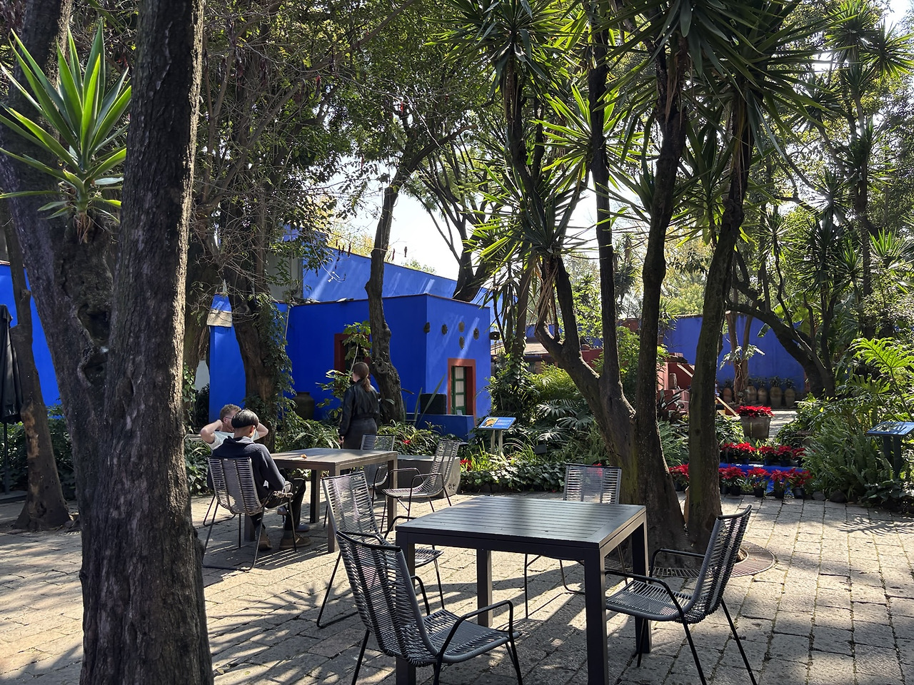 화장실까지도 집 분위기를 해치지 않게 슬그머니 파란 벽 한편에 녹아 있었다. 프리다칼로는 살아생전에 집에 손님들을 자주 초대했다는데, 과연 그때도 저곳이 화장실이었을까? 하는 엉뚱한 생각이 또 들었다. 근처에는 포토스팟인줄 알았더니 생각보다 별로였던 돌의자도 하나 덩그러니 놓여 있었다.
