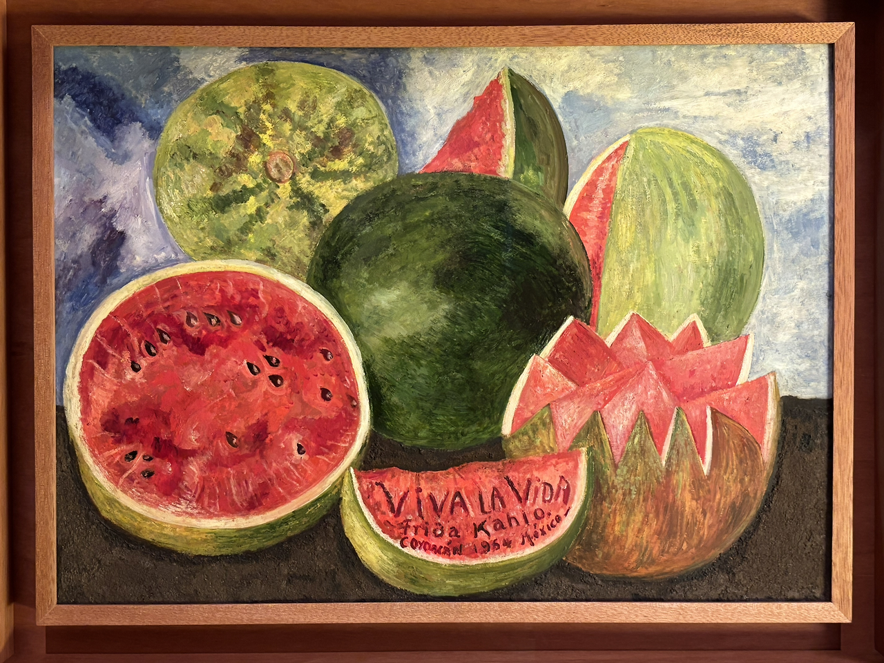"Viva La Vida", 프리다 칼로가 생을 마감하기 8일 전에 그린 수박 그림. 고통 속에서도 삶을 긍정하고자 했던 그녀의 마지막 메시지, "인생이여 만세". 밴드 Coldplay의 Viva la vida도 여기서 제목을 따왔다고 한다.