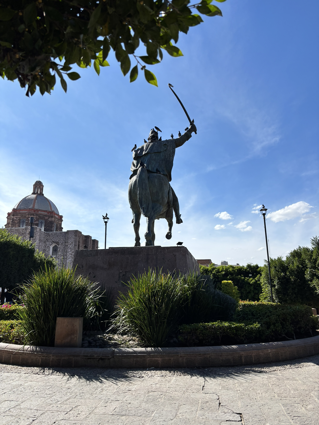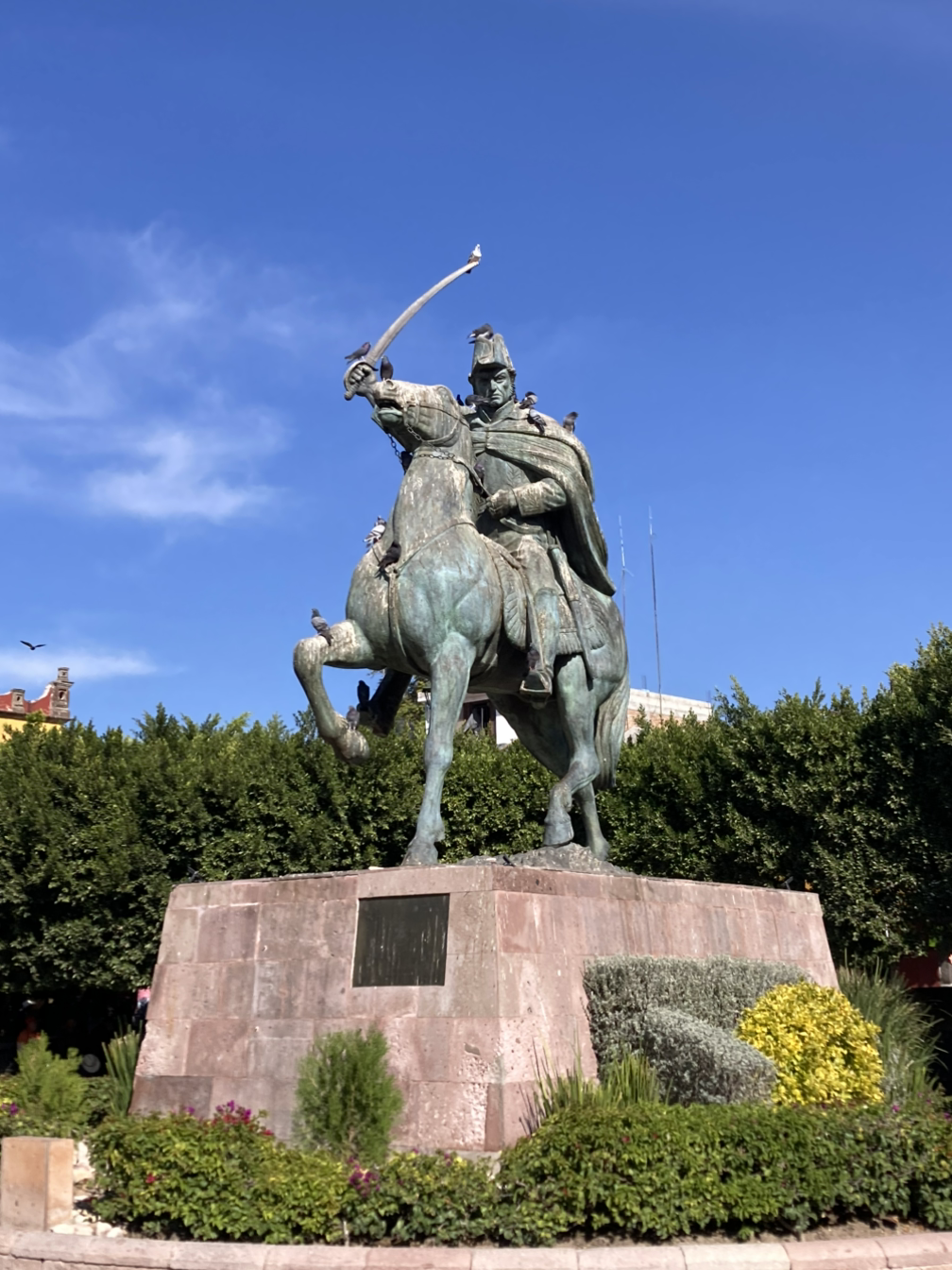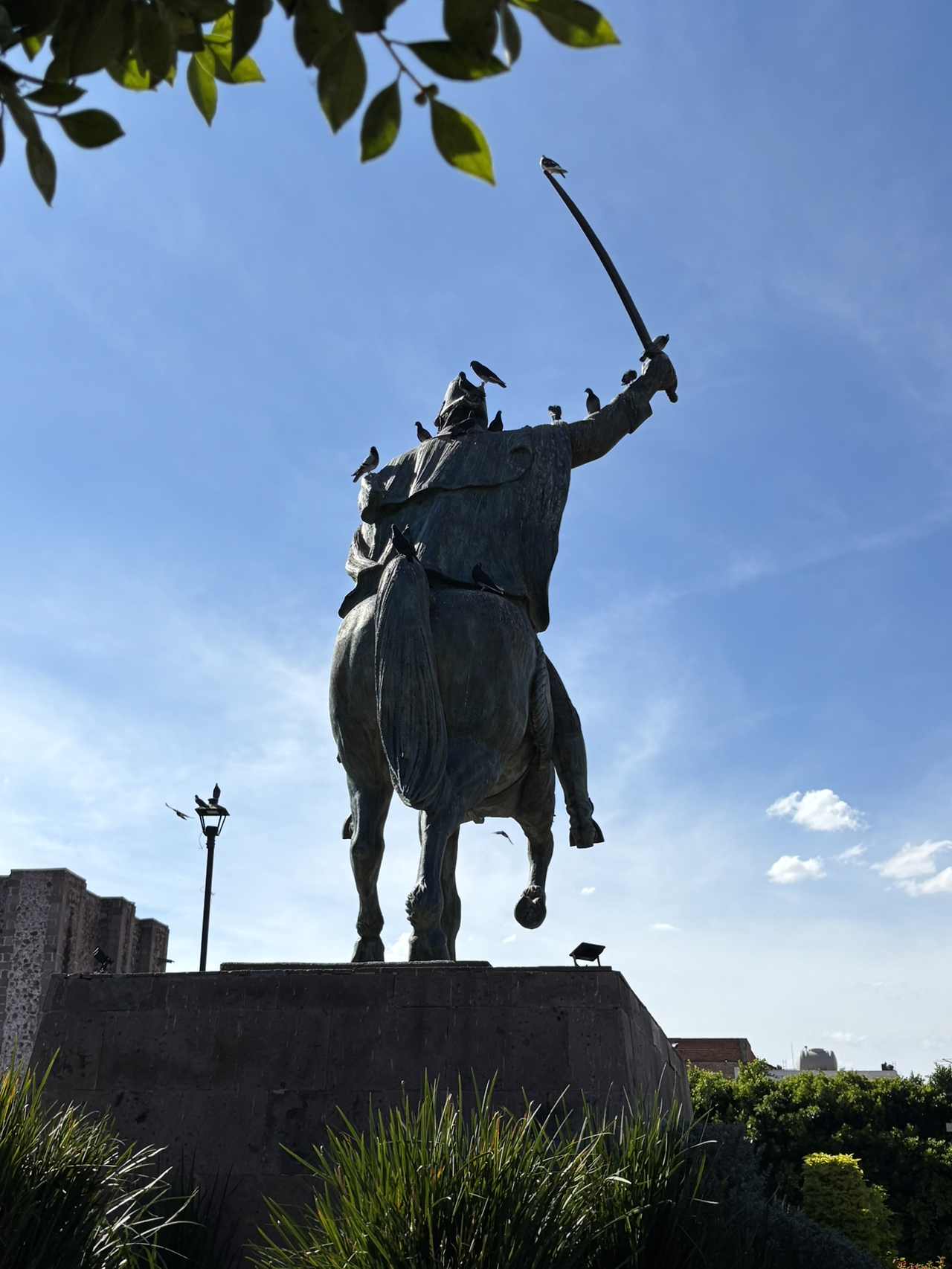 우리가 도착한 곳은 “Plaza civica”라는 곳으로, 멕시코 독립운동 영웅인 “이그나시오 아옌데(Ignacio Allende)” 장군 동상이 세워져 있다. 동상을 빙 둘러싼 벤치 중, 우리는 동상 뒤쪽의 나무 그늘 자리를 잡았다. 뒤에서 보니 그는 비둘기 전사였다. 영웅도 별 수 없다...